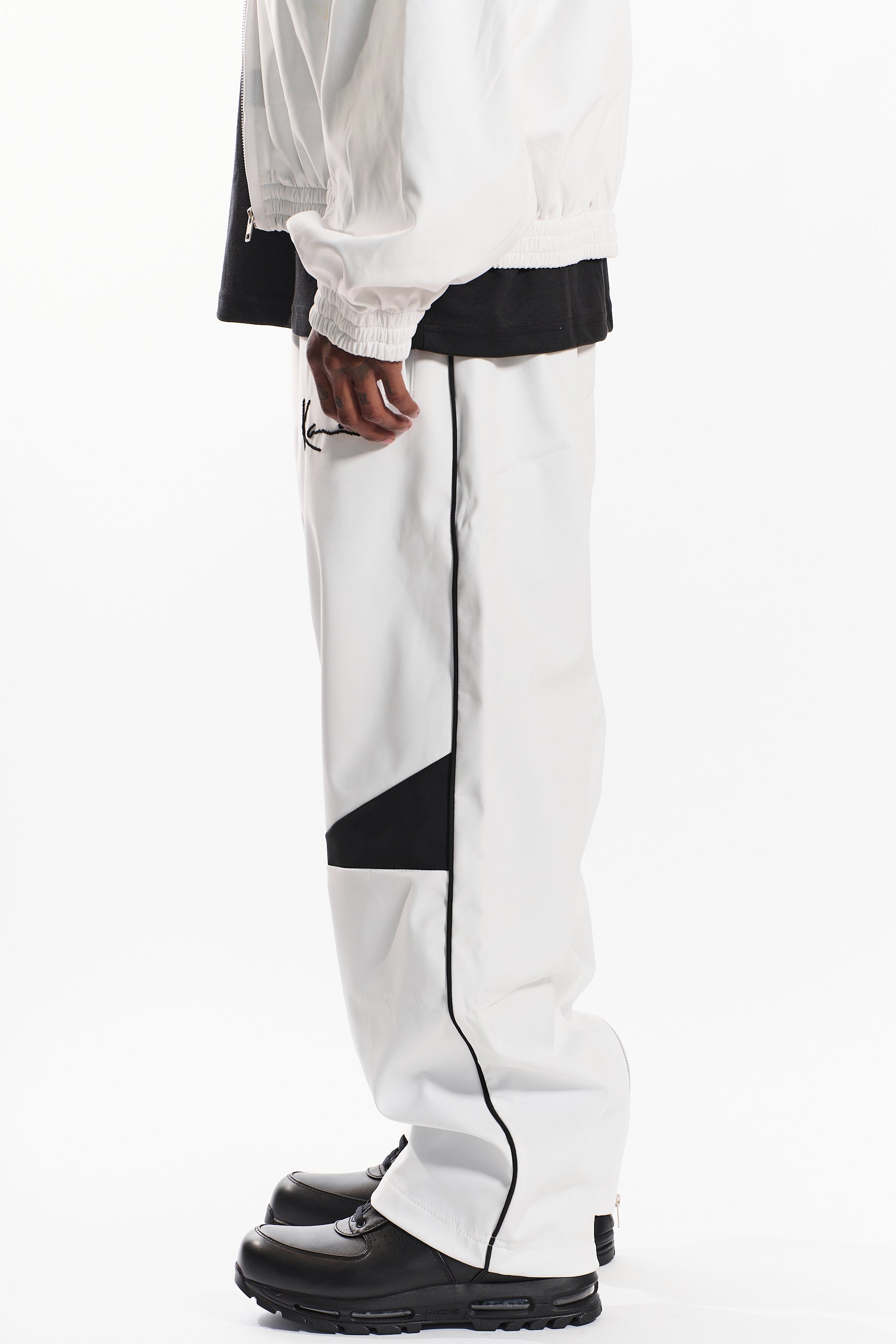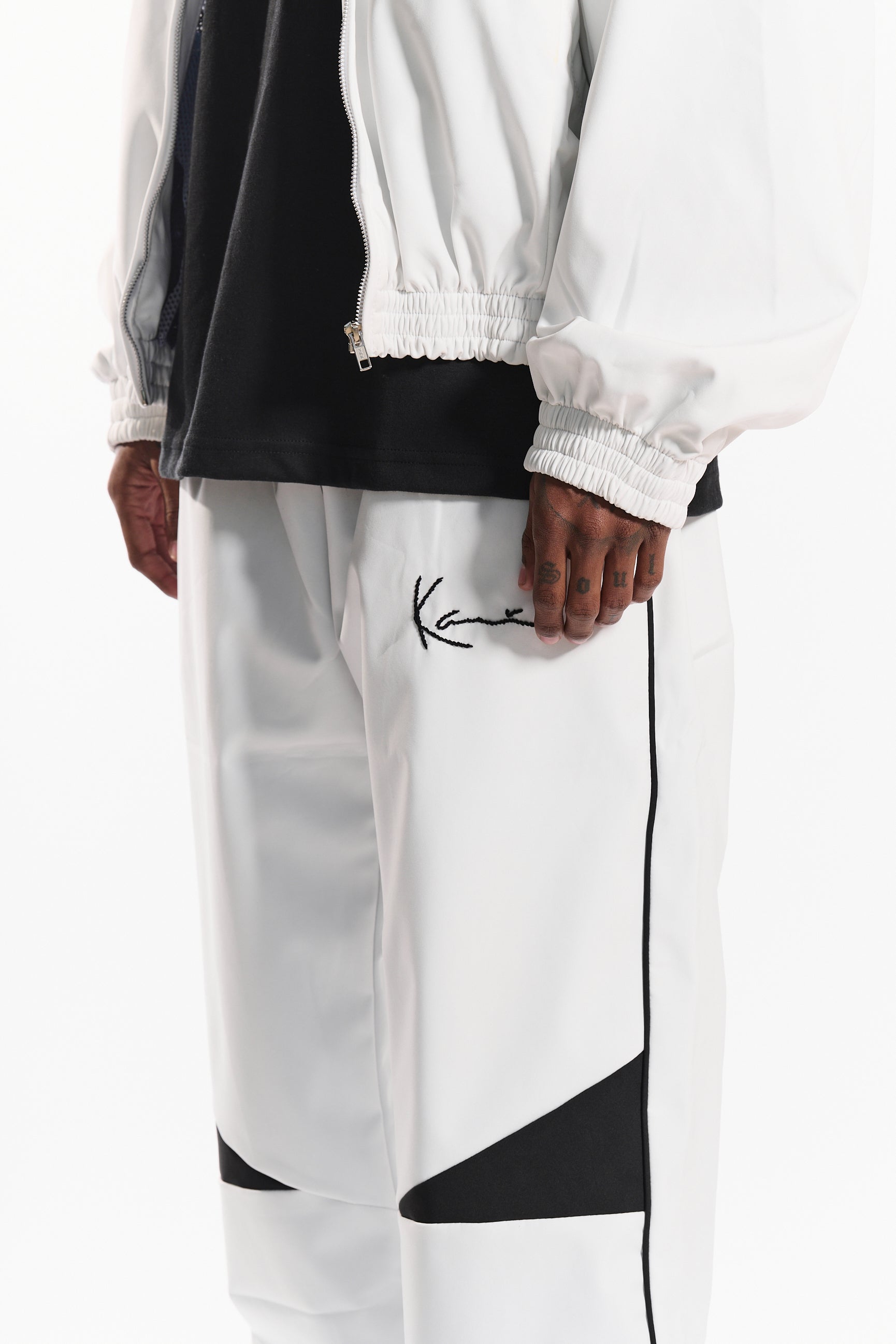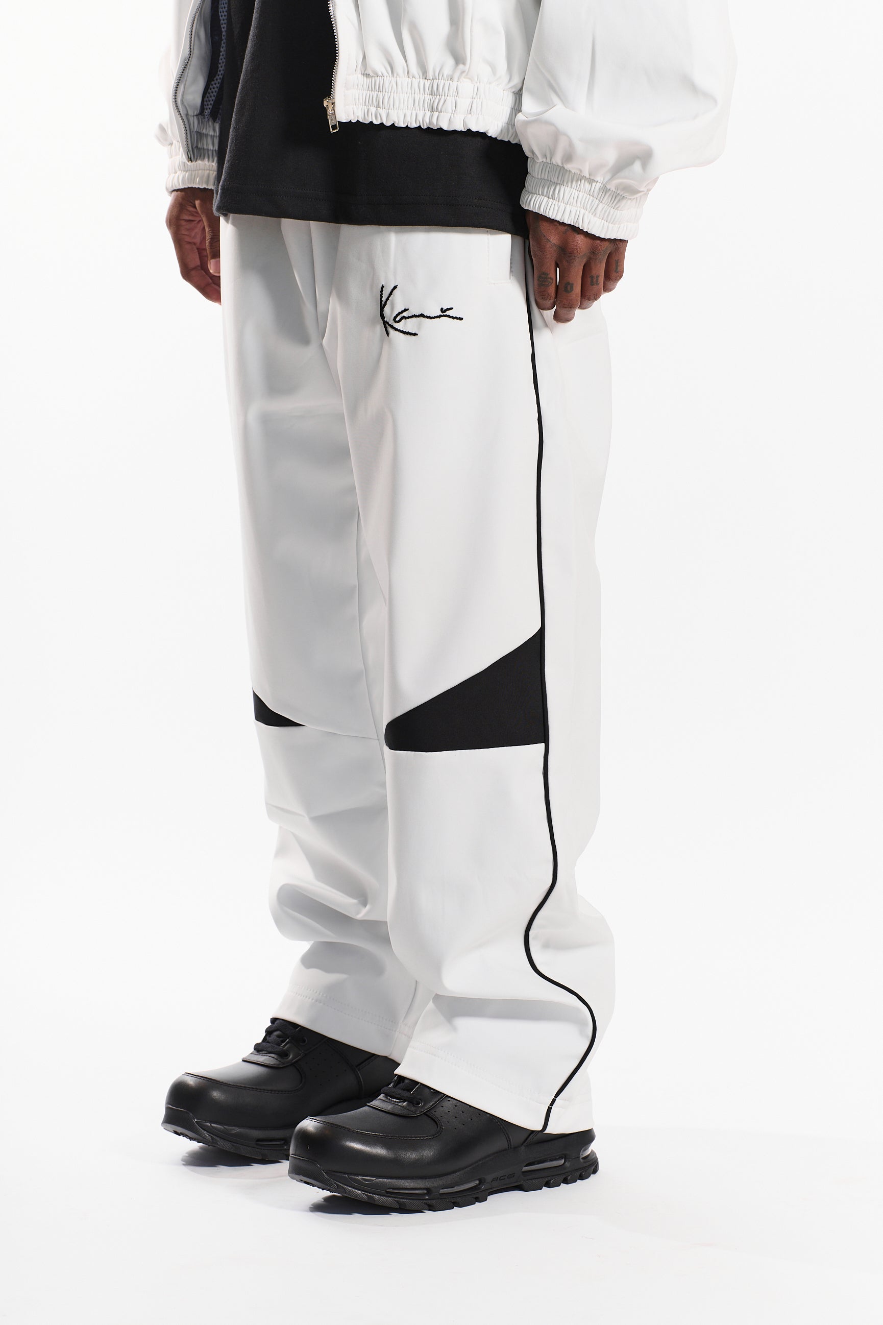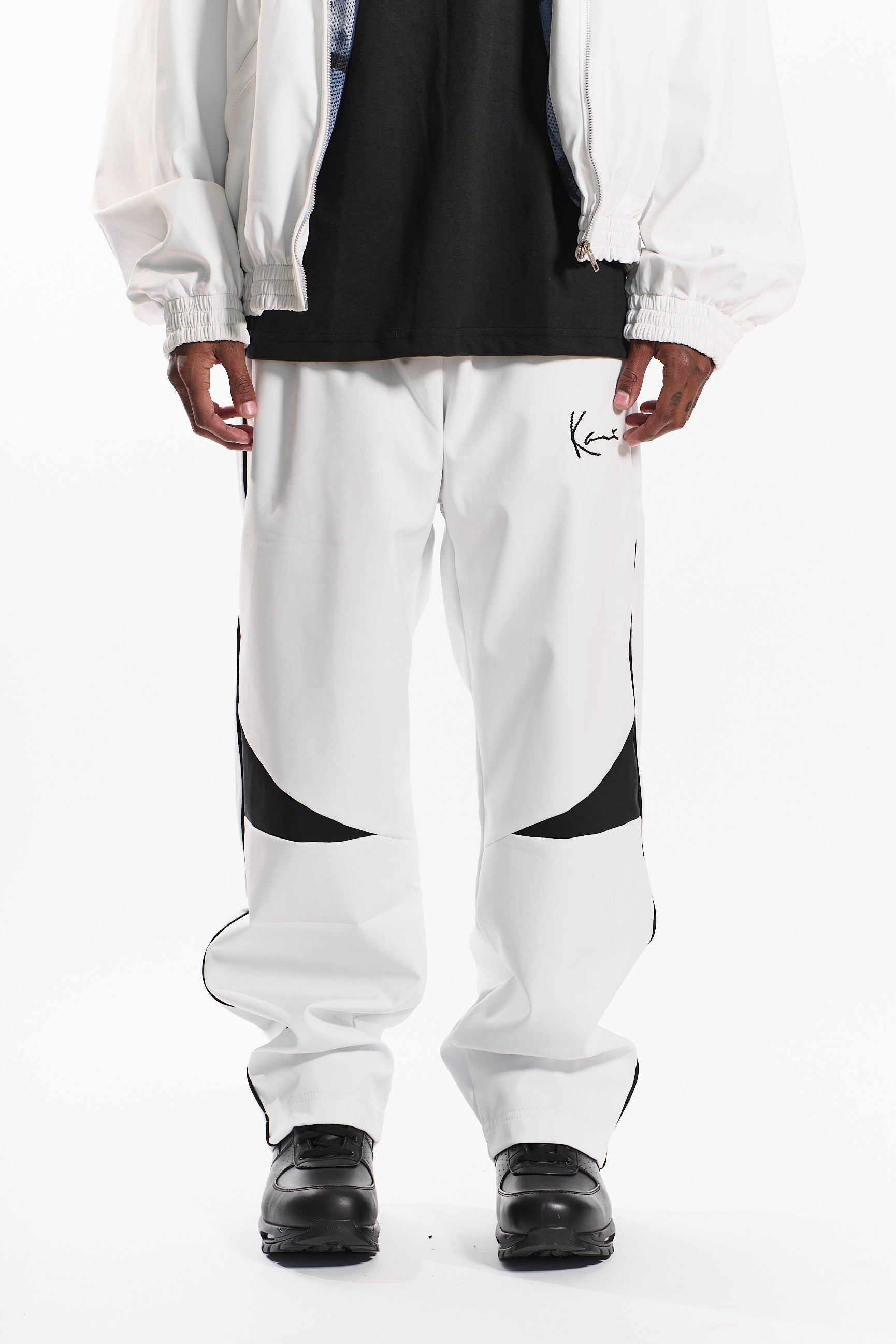 Featuring an elastic waistband with an adjustable fit, side pockets, and straight-leg silhouette for a clean, athletic look. The crisp cloud whisper white base is accented by bold black noir geometric panels and hand stitched Kani logo embroidery, delivering a statement-making contrast that stands out.