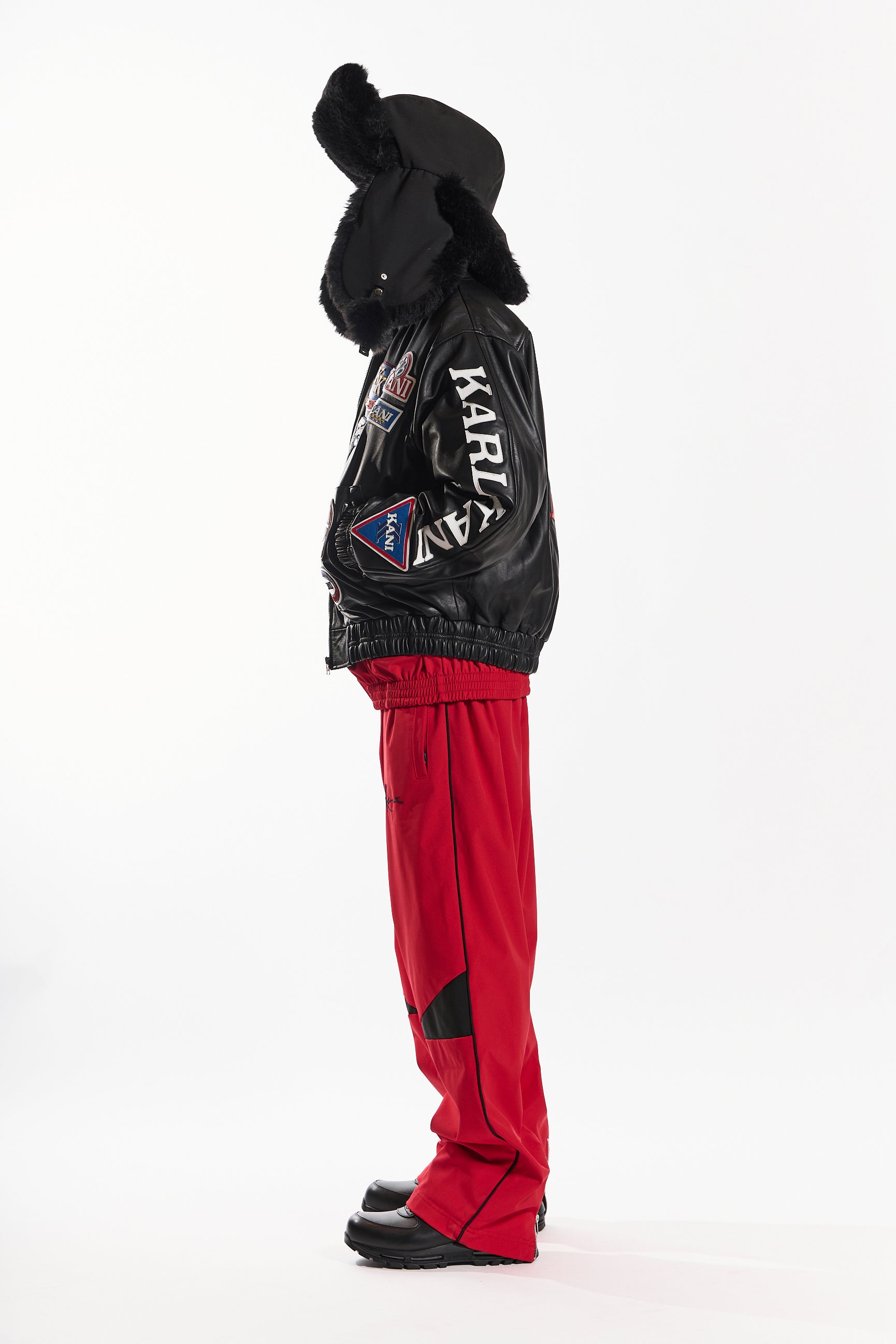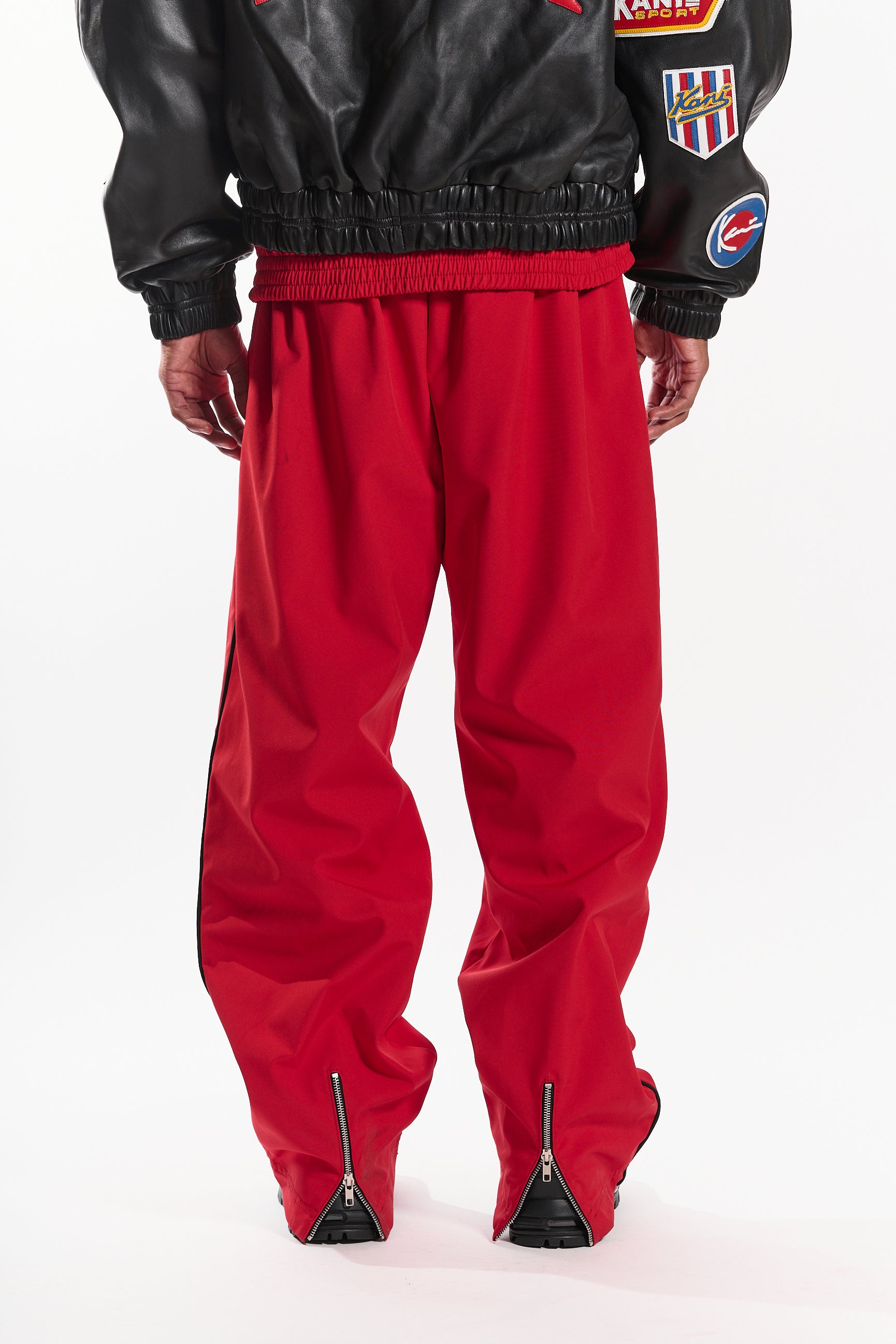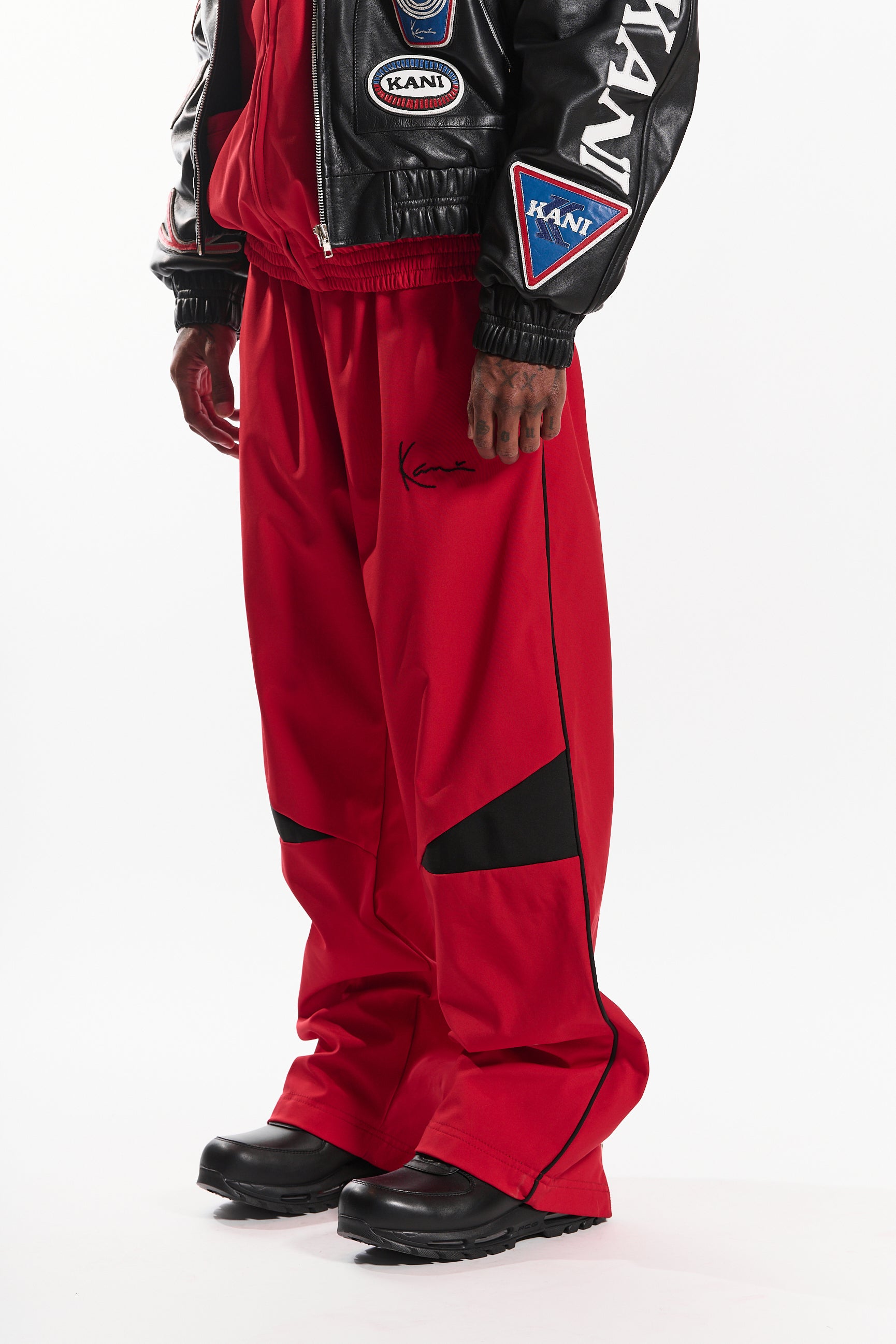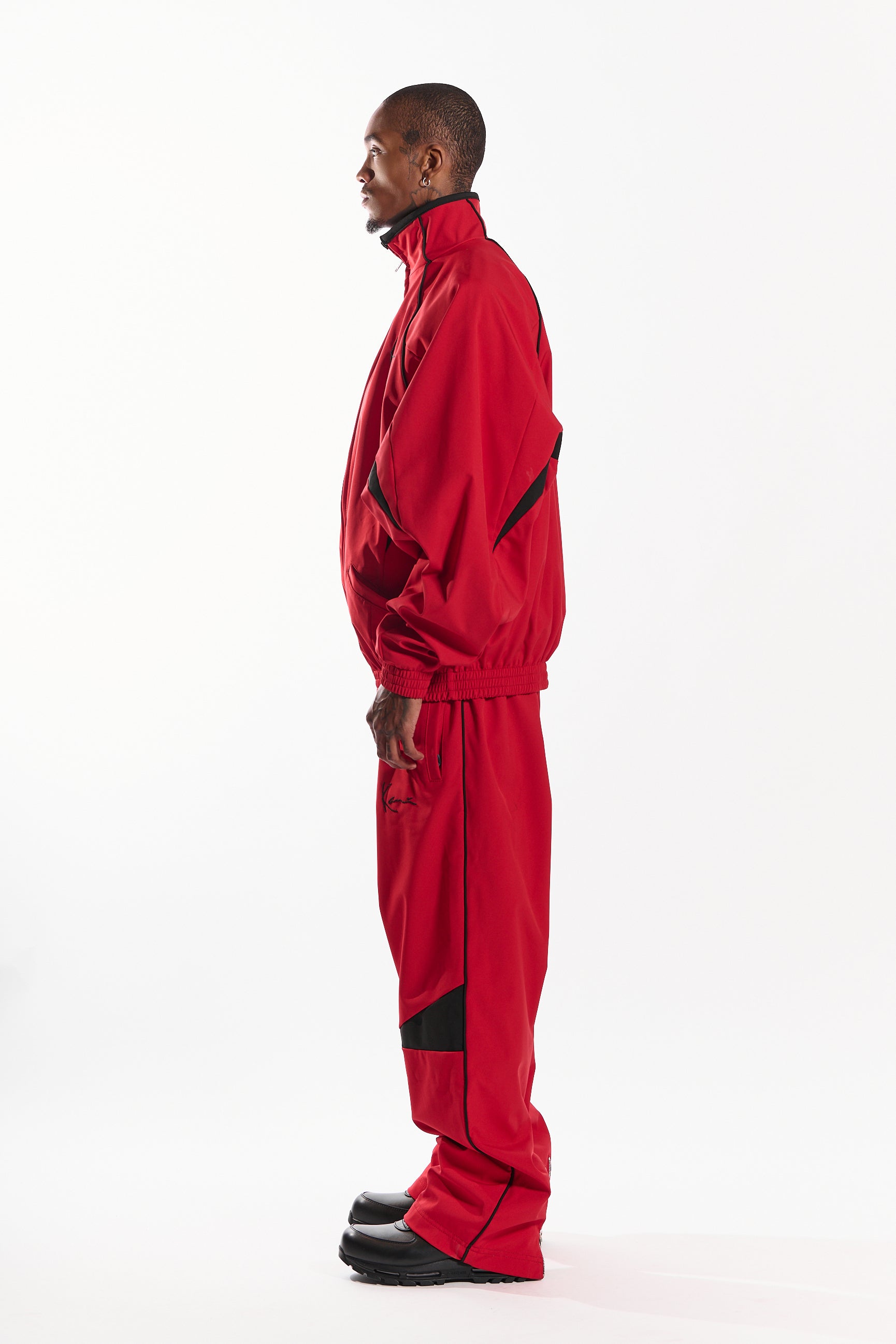 Featuring an elastic waistband with an adjustable fit, side pockets, and straight-leg silhouette for a clean, athletic look. The red base is accented by bold black noir geometric panels and hand stitched Kani logo embroidery, delivering a statement-making contrast that stands out.
