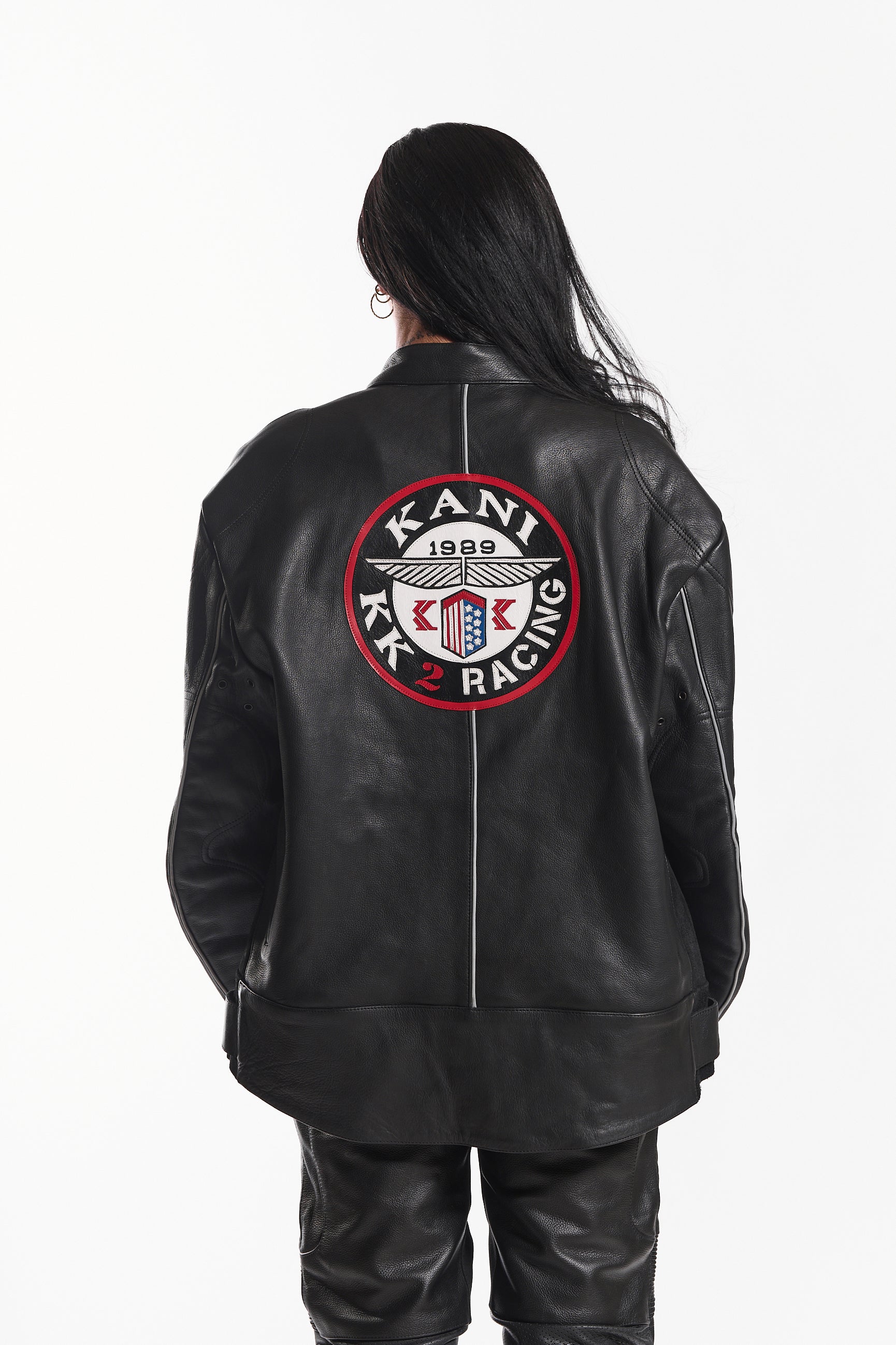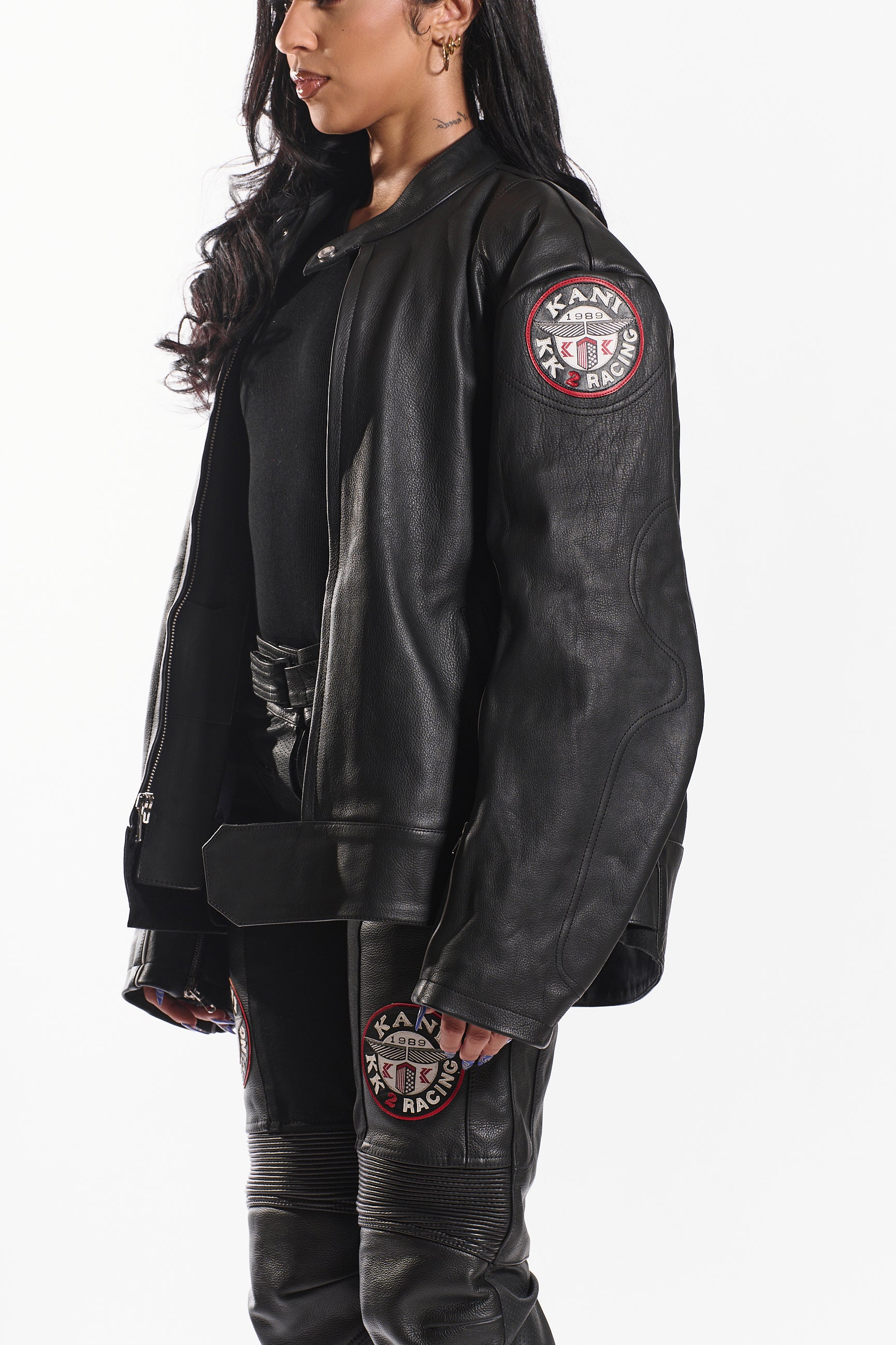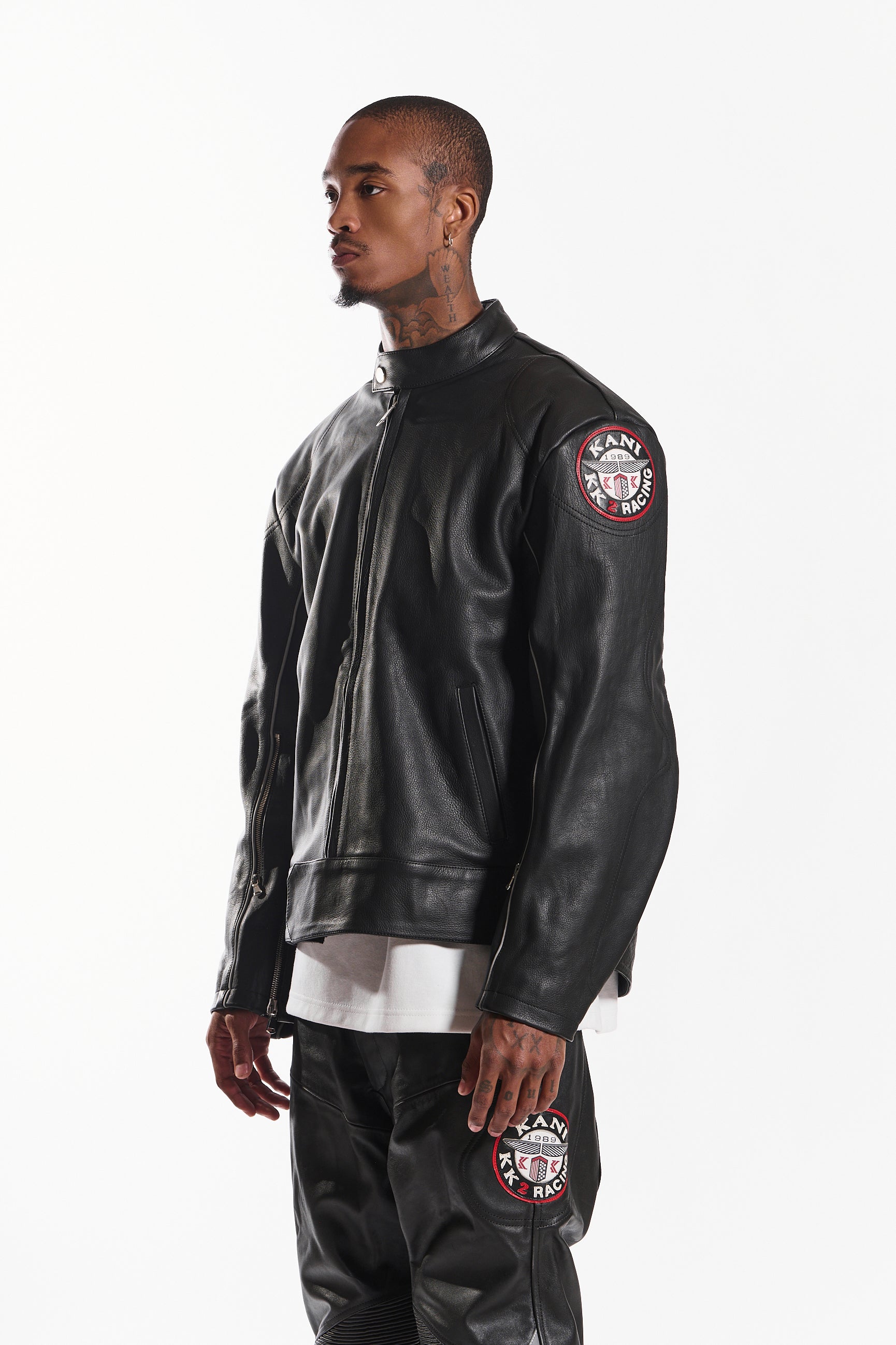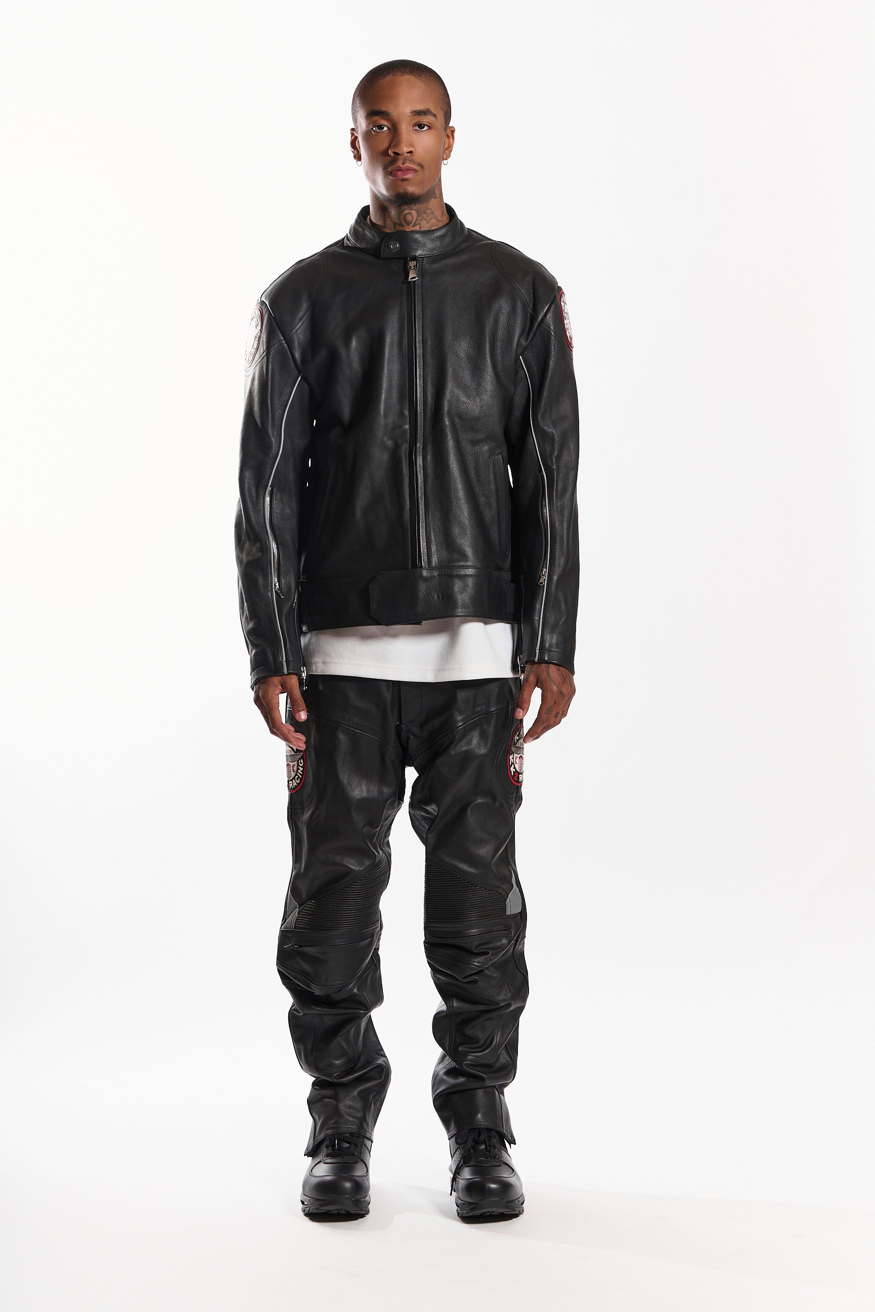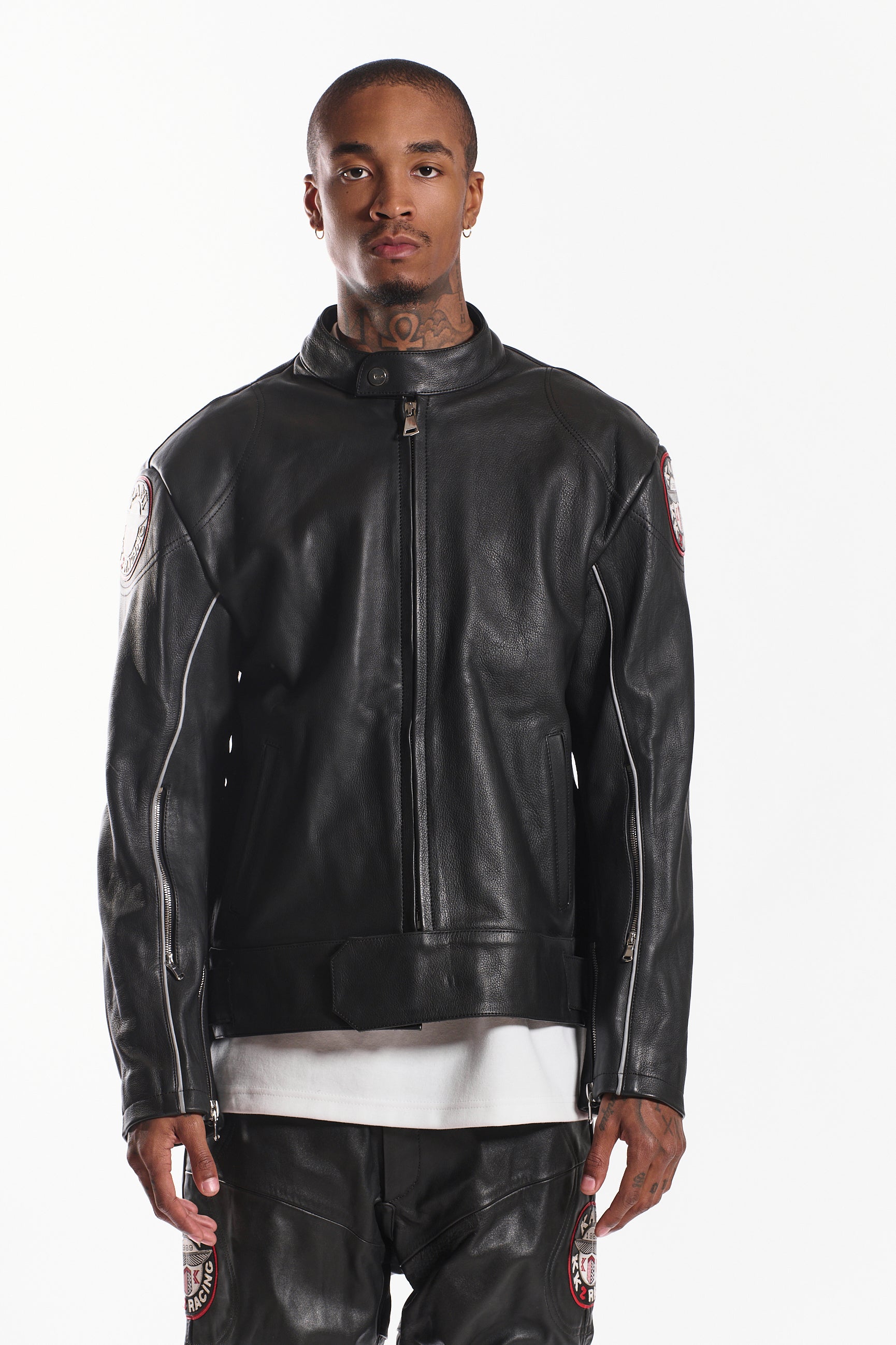 Made from genuine cowhide leather, it offers a structured fit, lasting durability, and a sleek, high-end finish. Designed with a snap-tab collar, front zipper closure with wind flap, and adjustable waist straps, this jacket blends function with style. Signature embroidered race patches on each sleeve add a statement touch, while zippered cuffs and contrast piping complete the look.