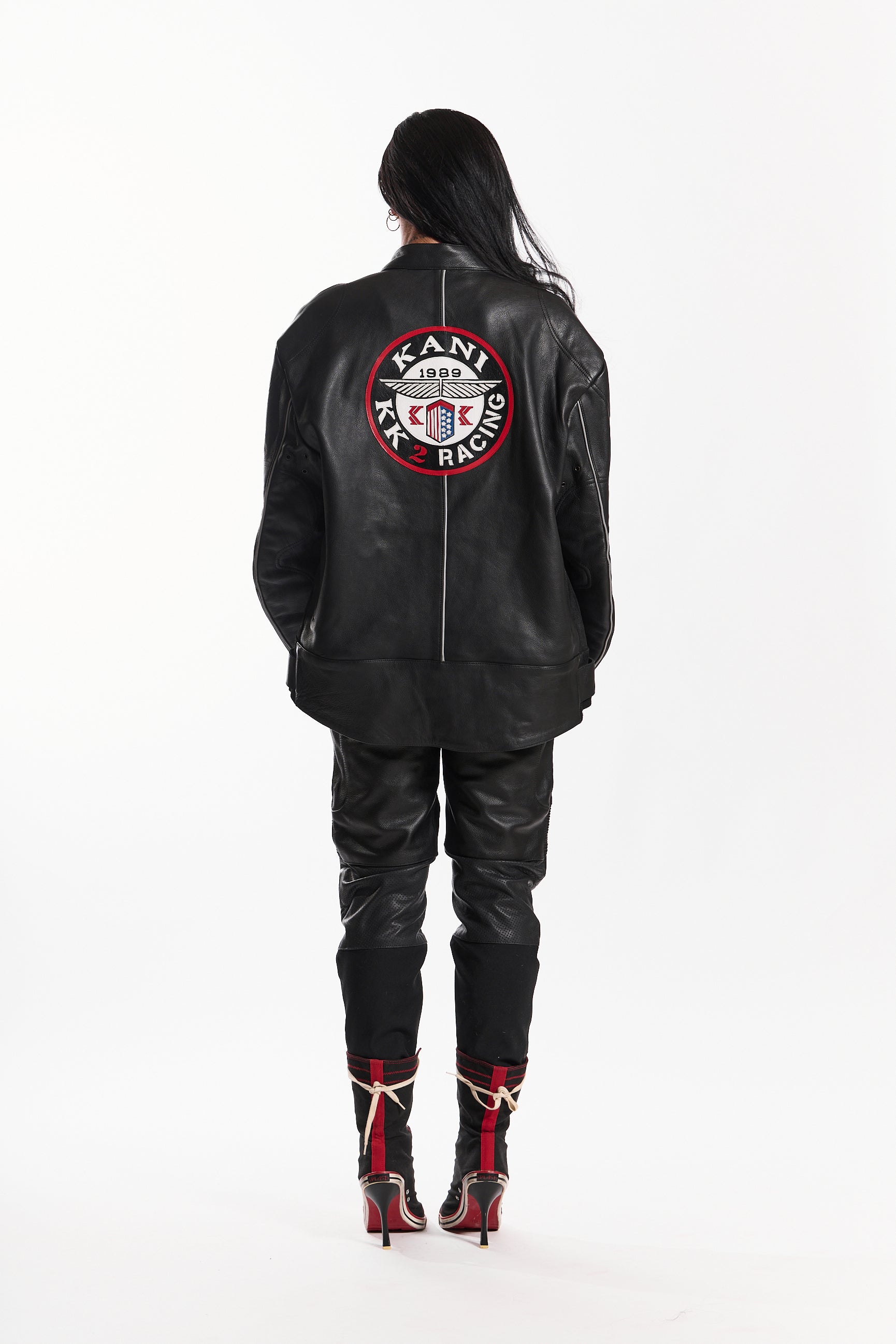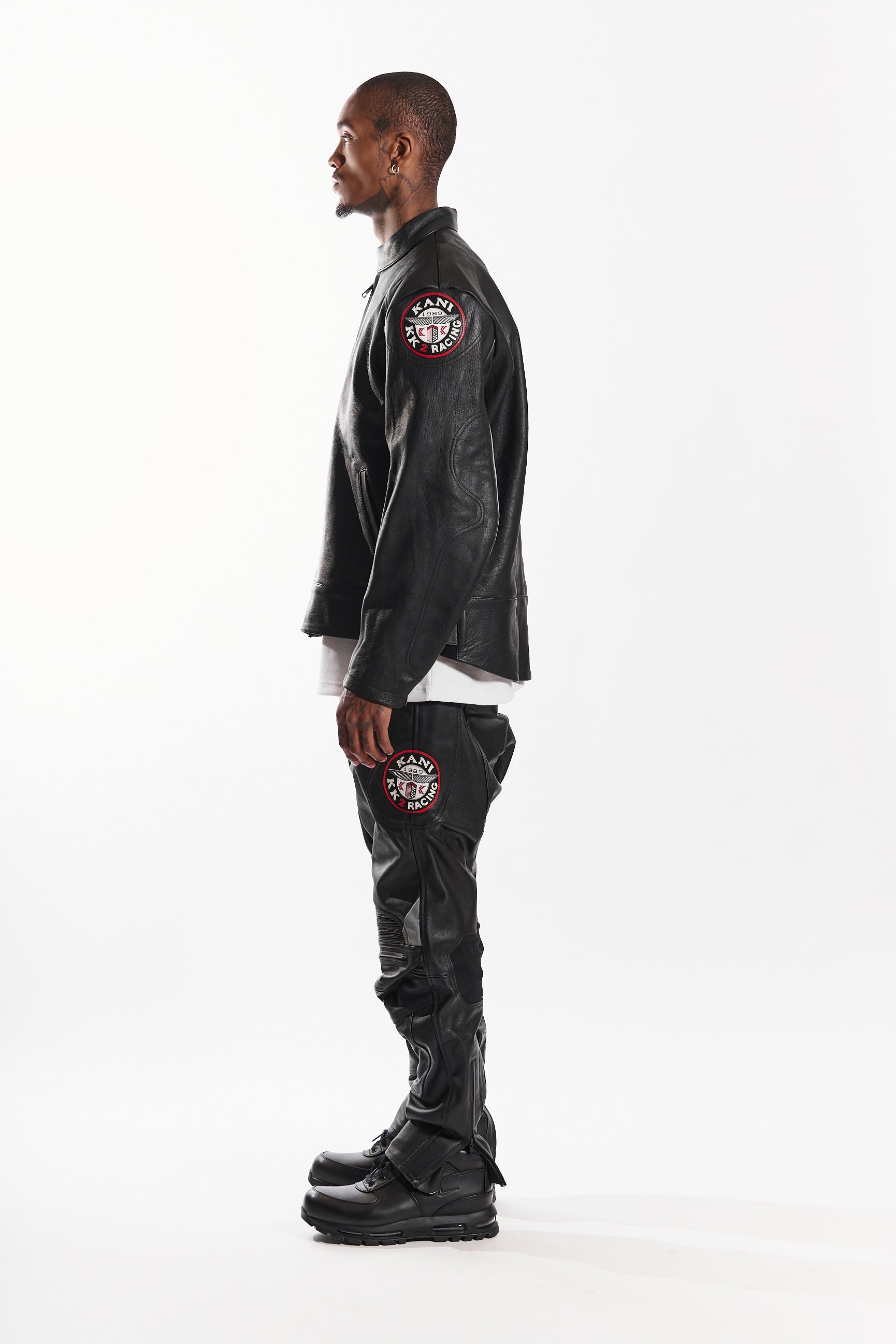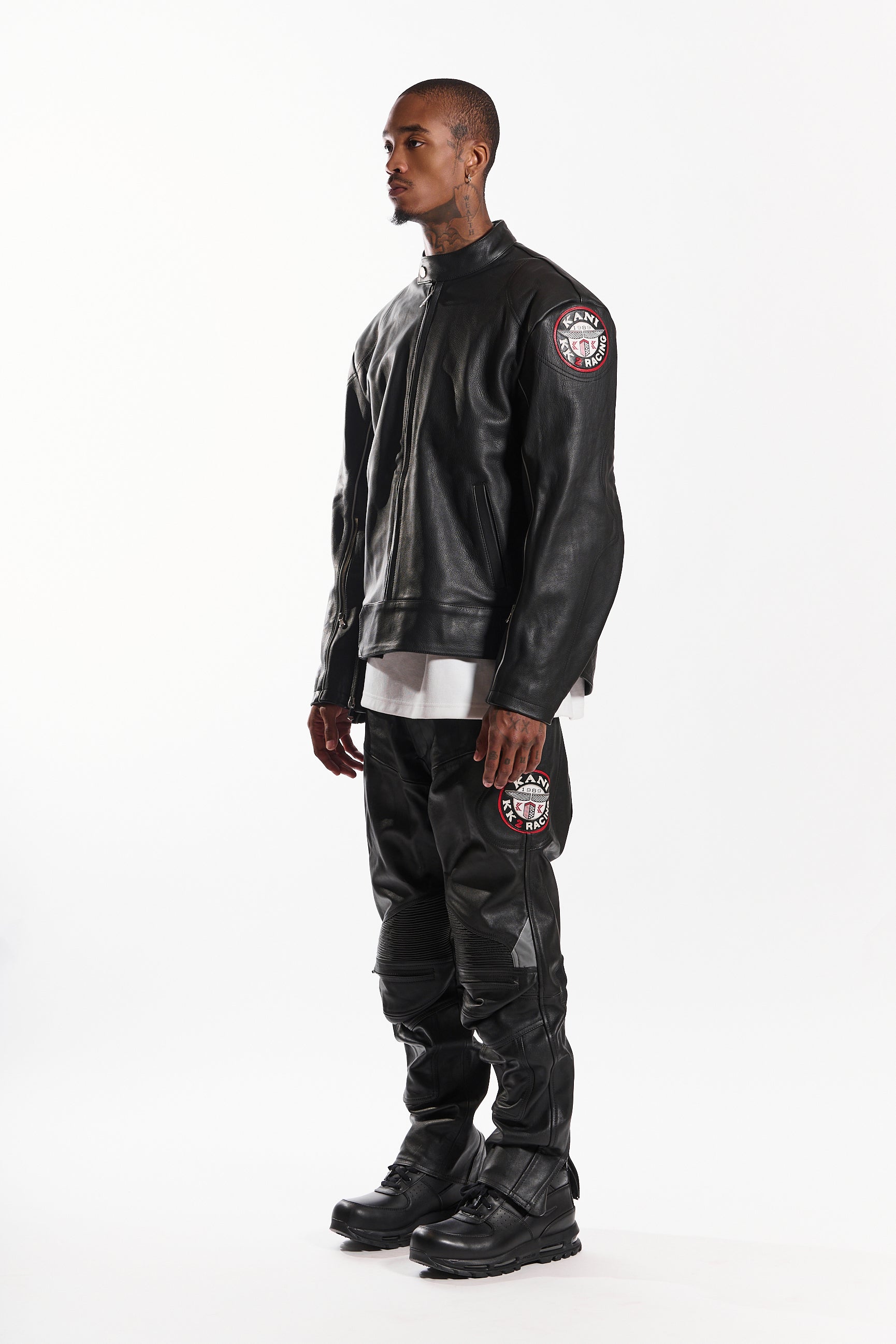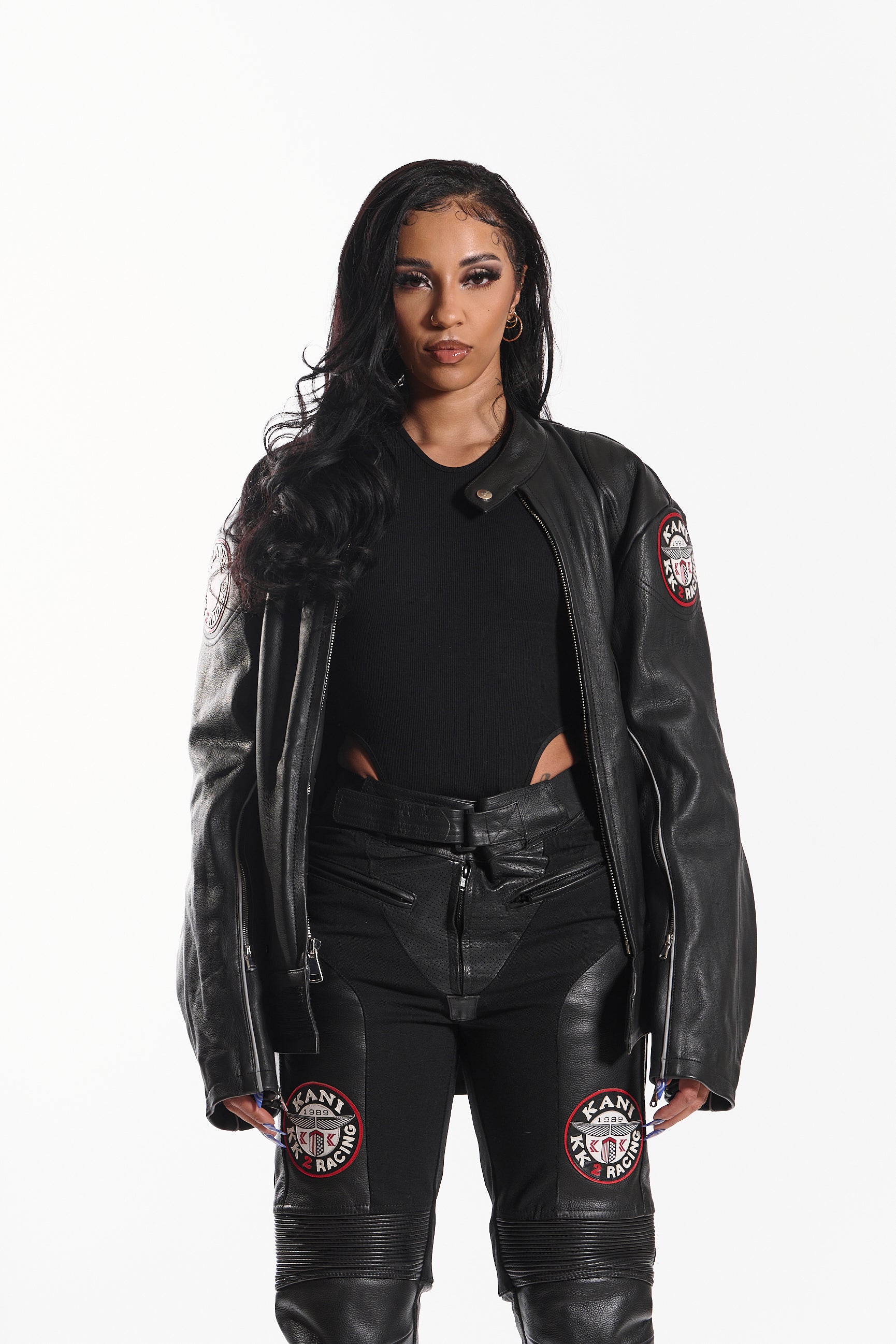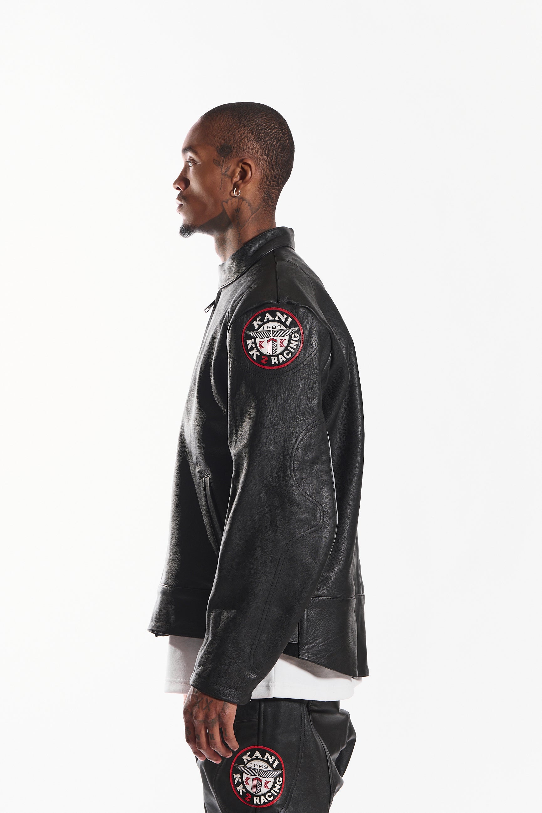 Made from genuine cowhide leather, it offers a structured fit, lasting durability, and a sleek, high-end finish. Designed with a snap-tab collar, front zipper closure with wind flap, and adjustable waist straps, this jacket blends function with style. Signature embroidered race patches on each sleeve add a statement touch, while zippered cuffs and contrast piping complete the look.