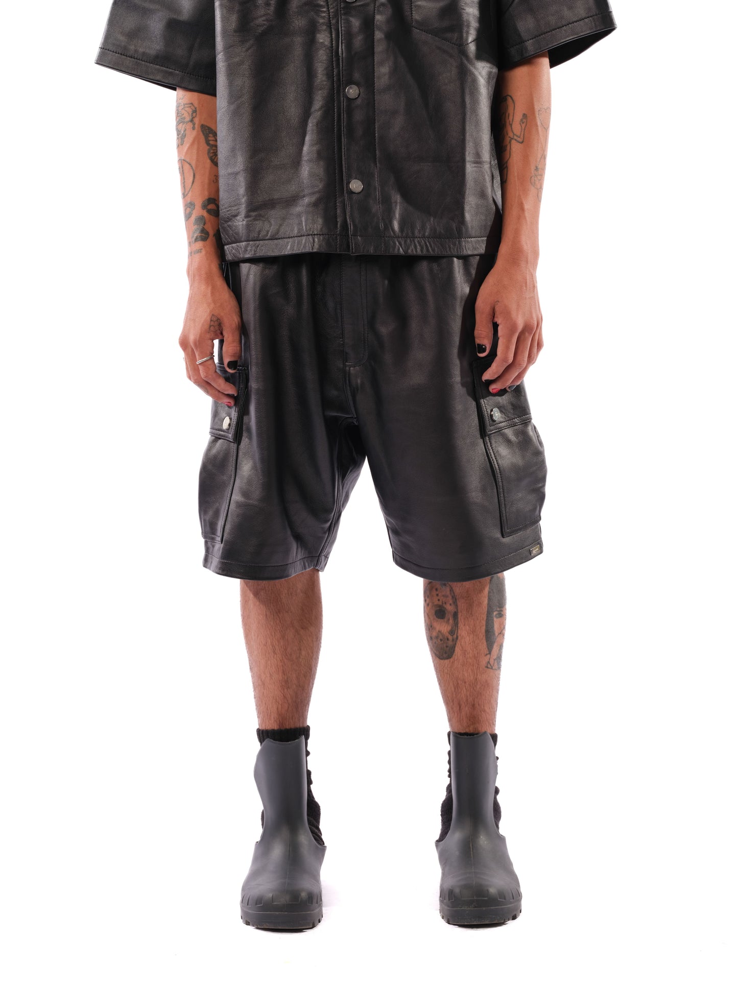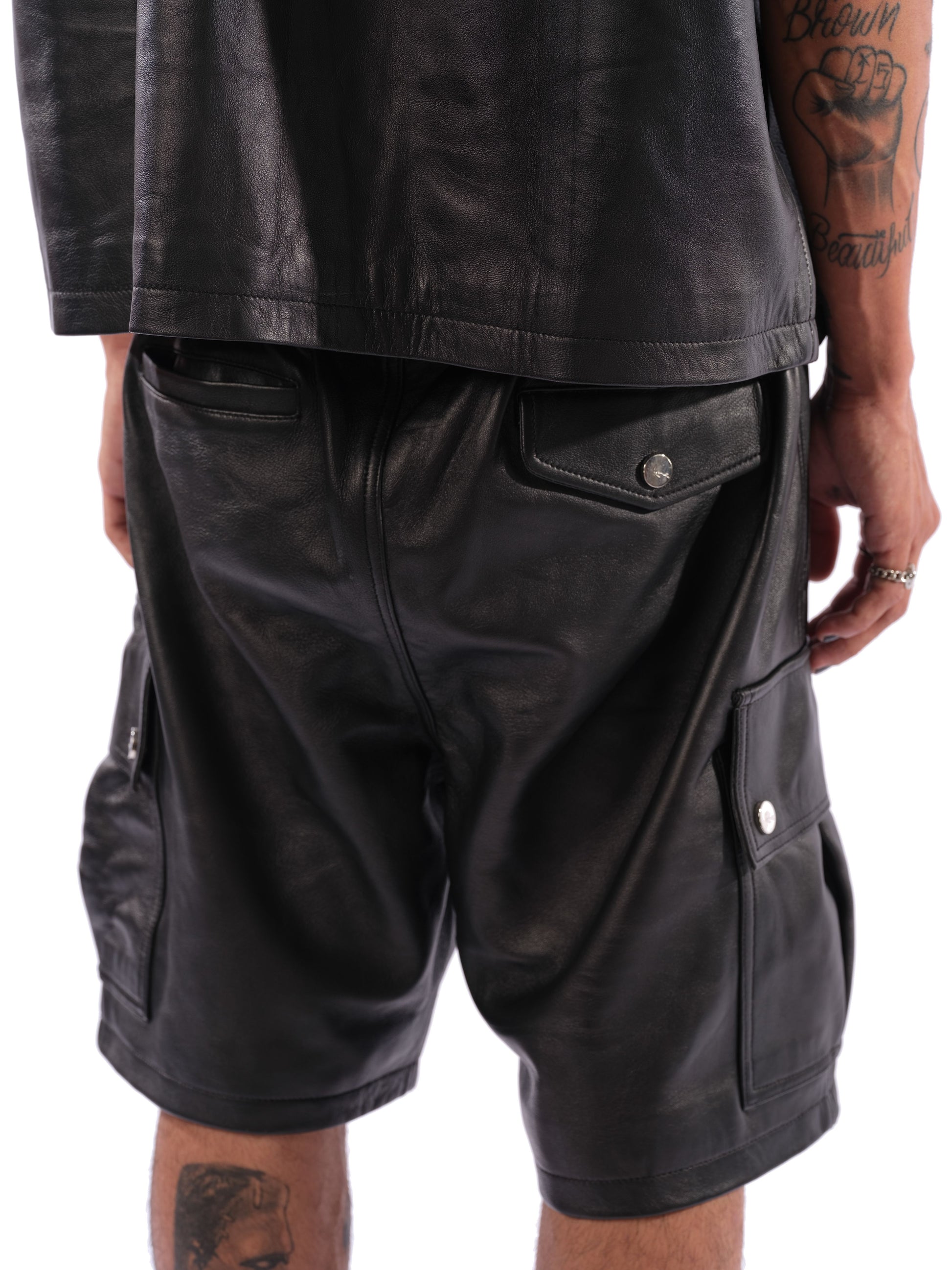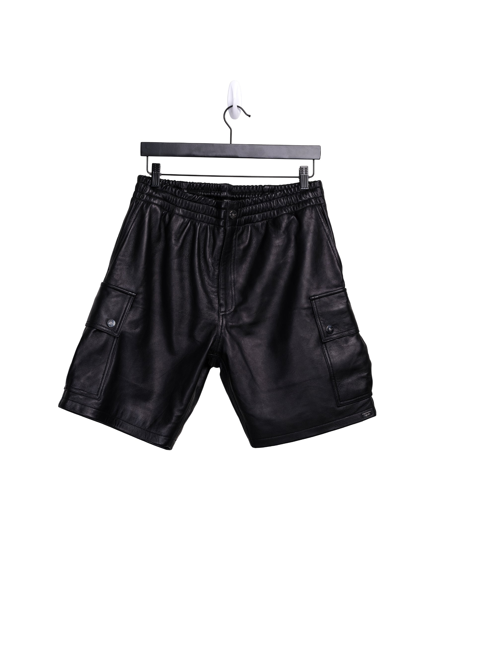 These classic Karl Kani cargo shorts are crafted in leather and feature oversized pockets on each thigh. The pocket flaps close with functional snaps—each one finished in galvanic, made by barrel, and polished to a shiny finish. Designed for comfort, the shorts come with an elastic waistband for a flexible fit.