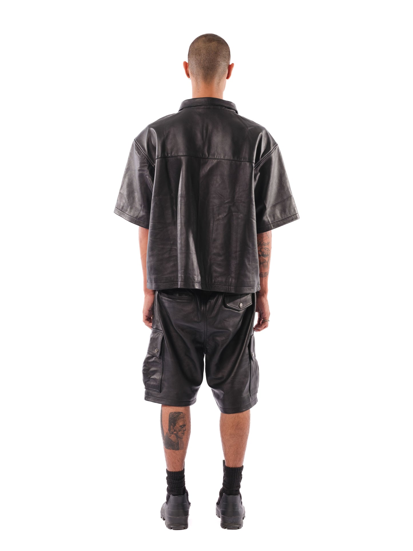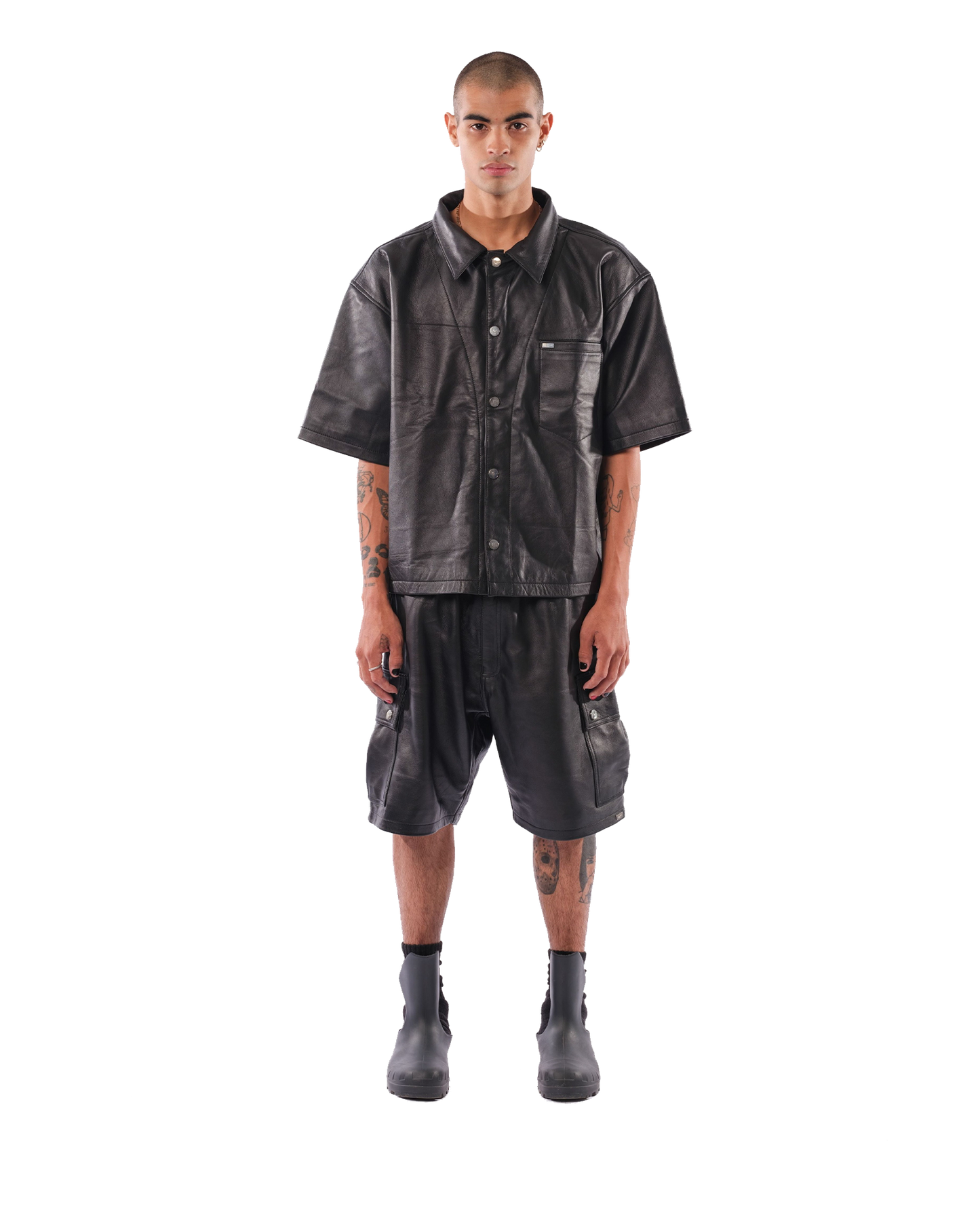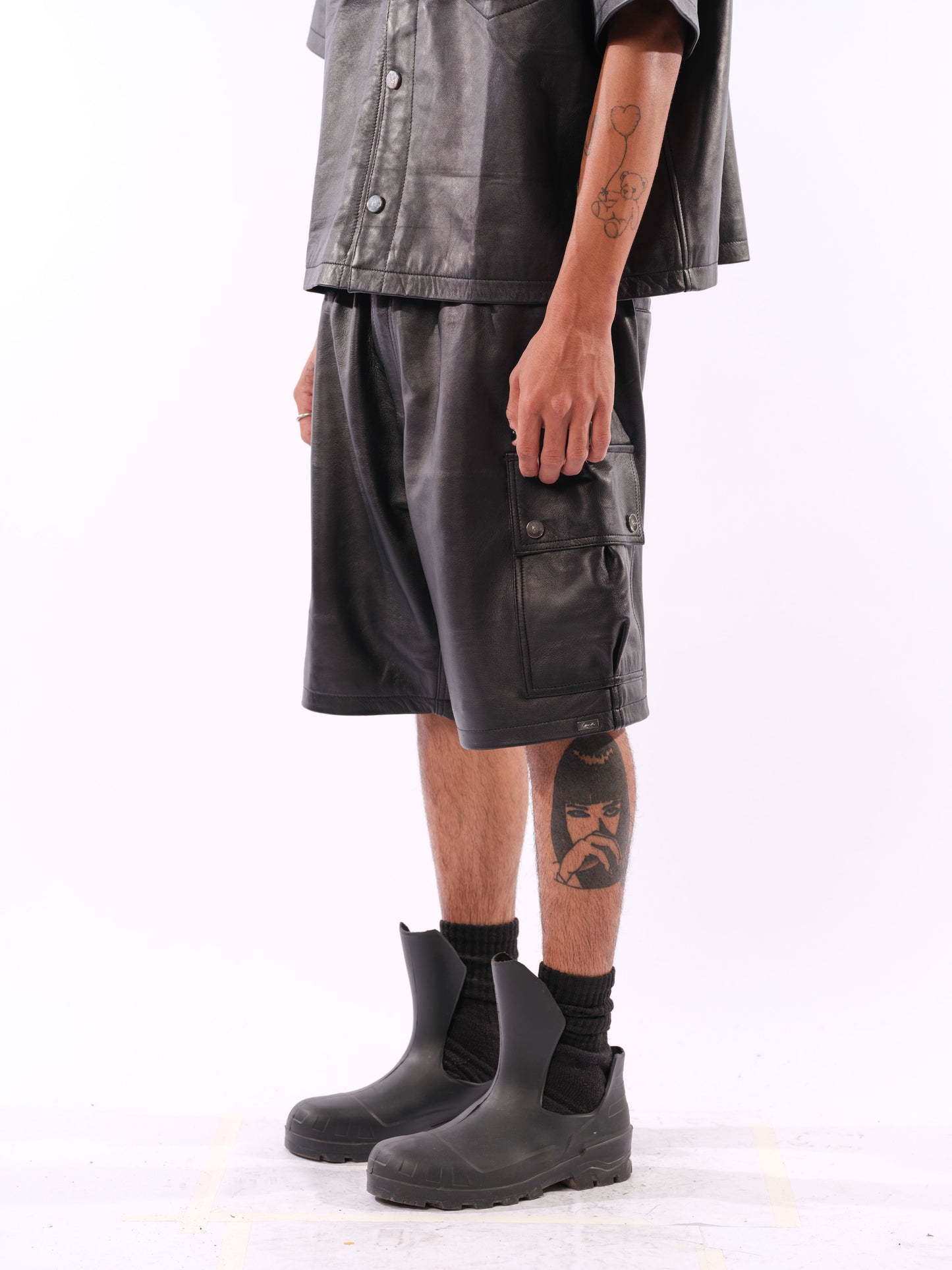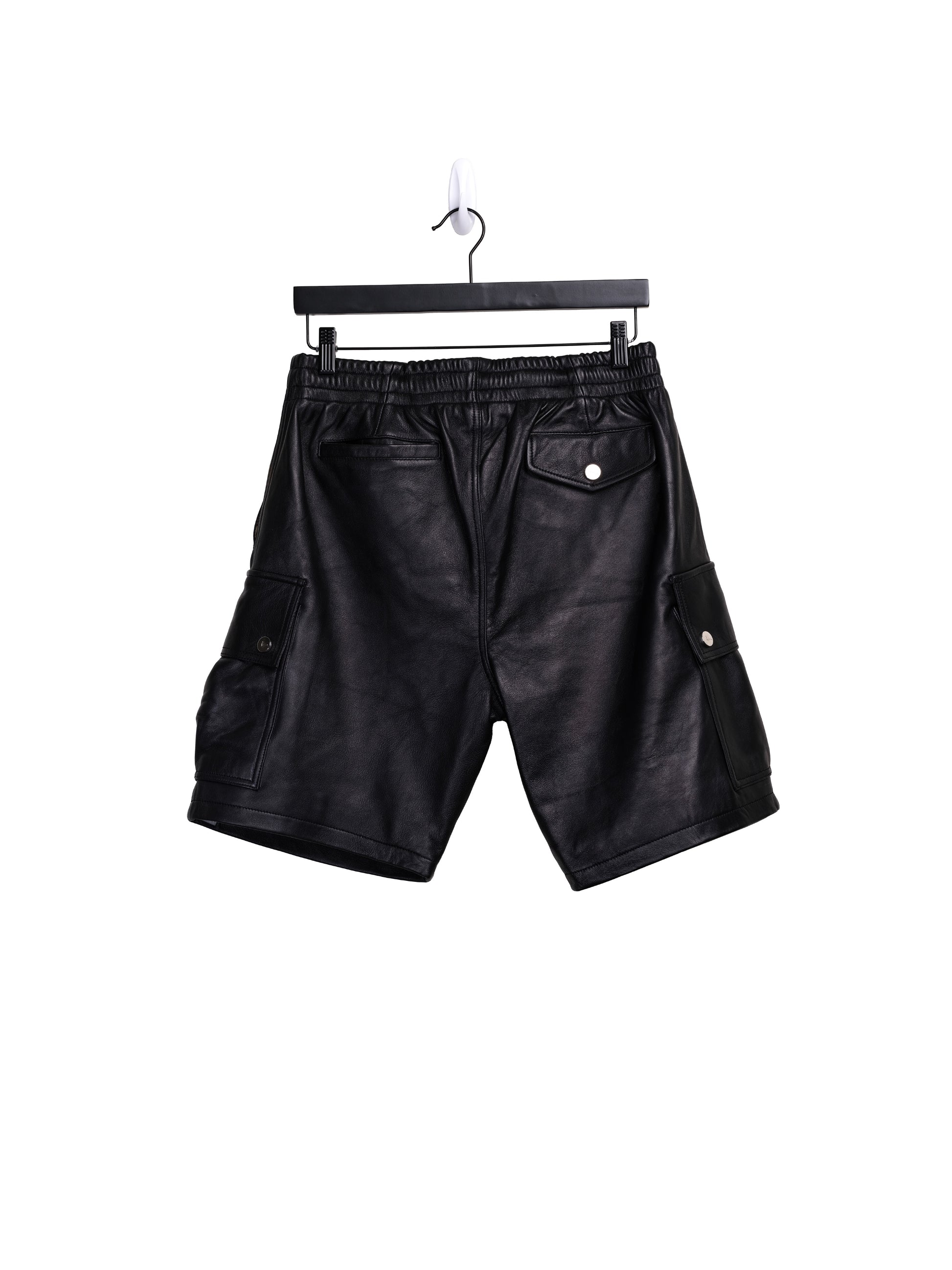 These classic Karl Kani cargo shorts are crafted in leather and feature oversized pockets on each thigh. The pocket flaps close with functional snaps—each one finished in galvanic, made by barrel, and polished to a shiny finish. Designed for comfort, the shorts come with an elastic waistband for a flexible fit.