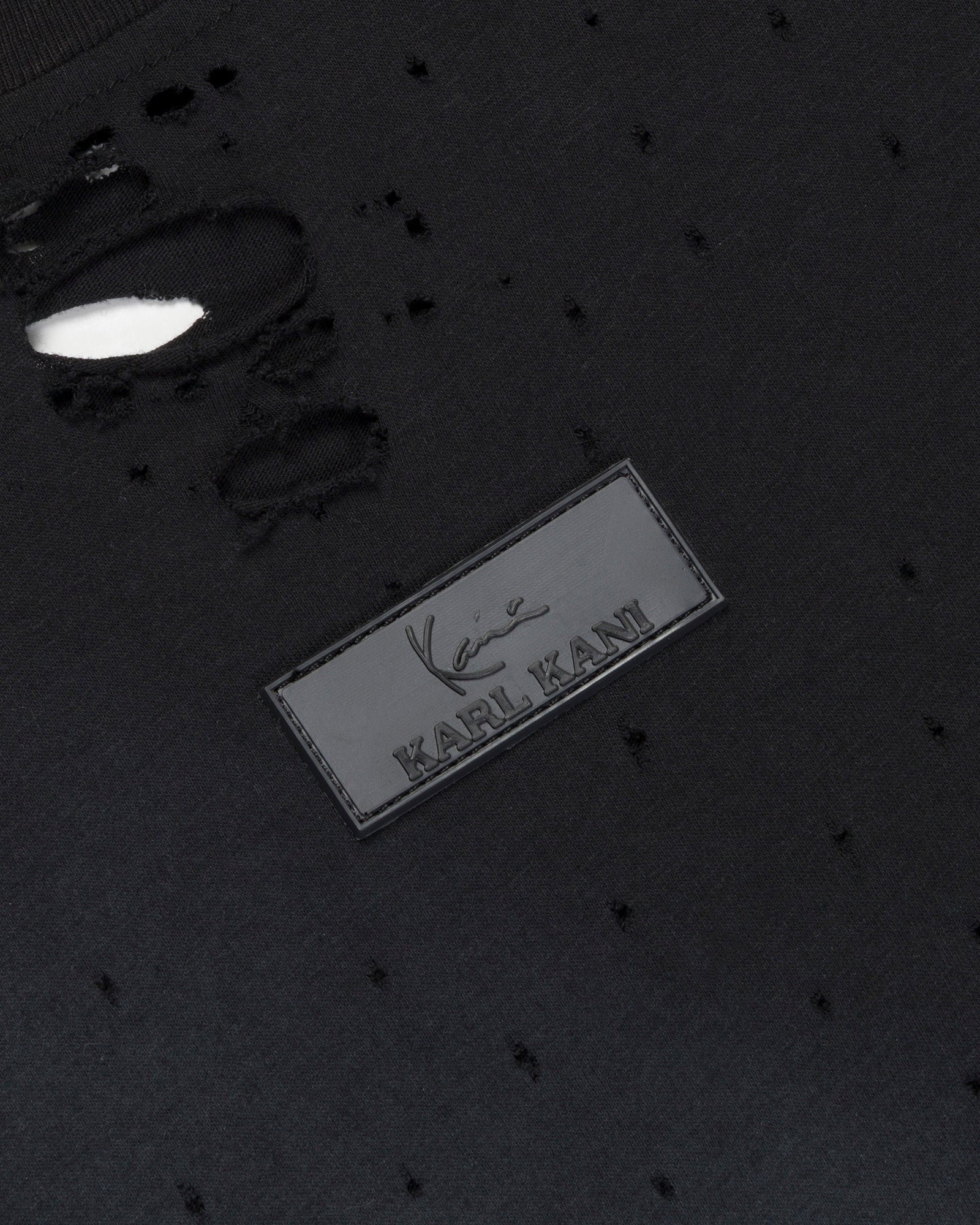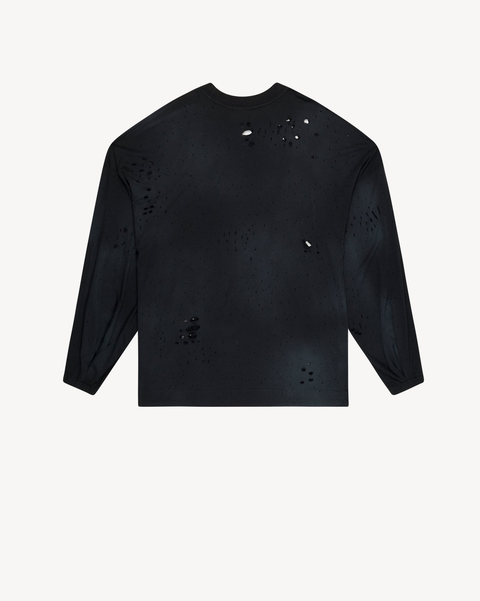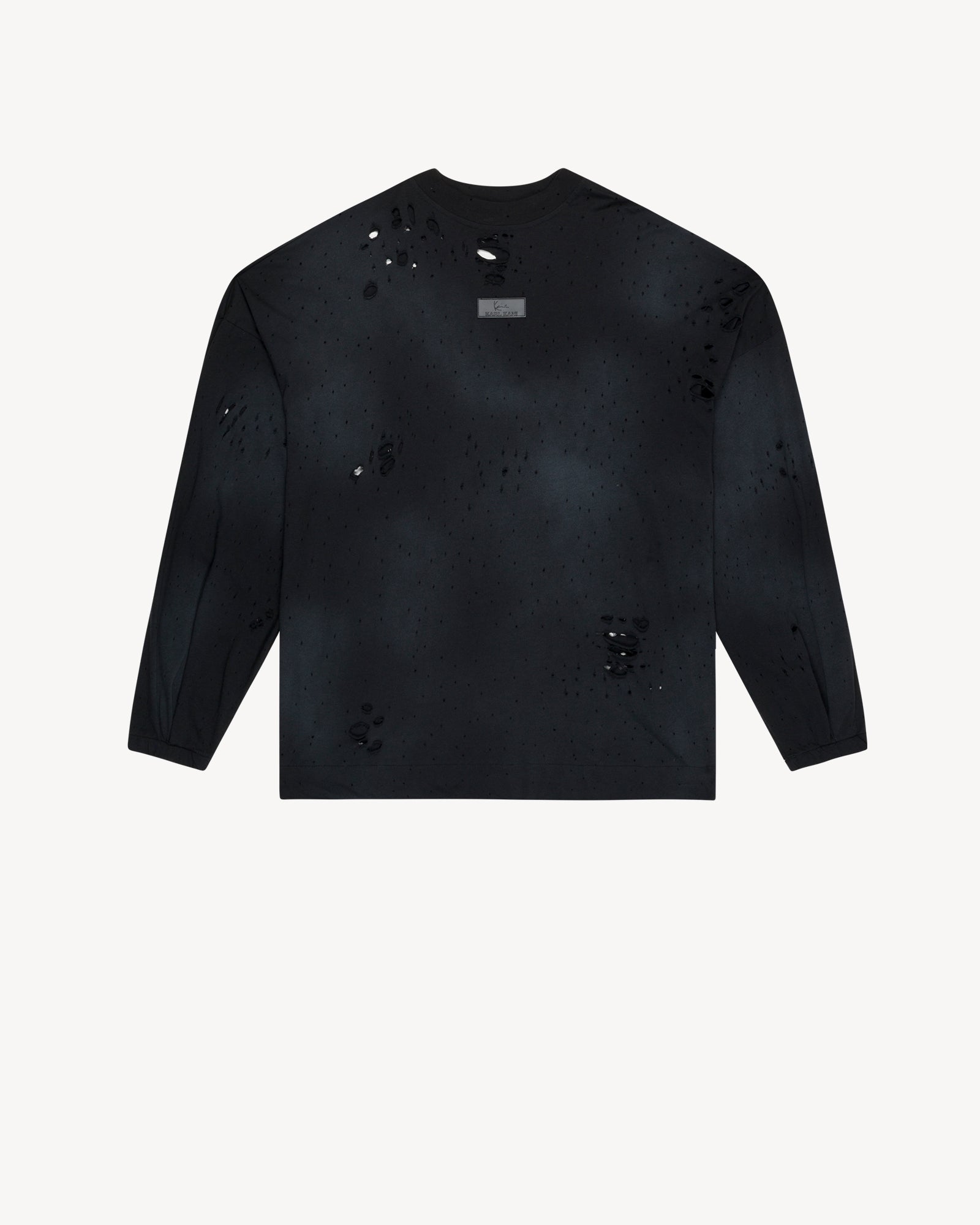 The “Loose Rap” long sleeve tee in noir black redefines everyday streetwear with a distressed, lived-in edge.