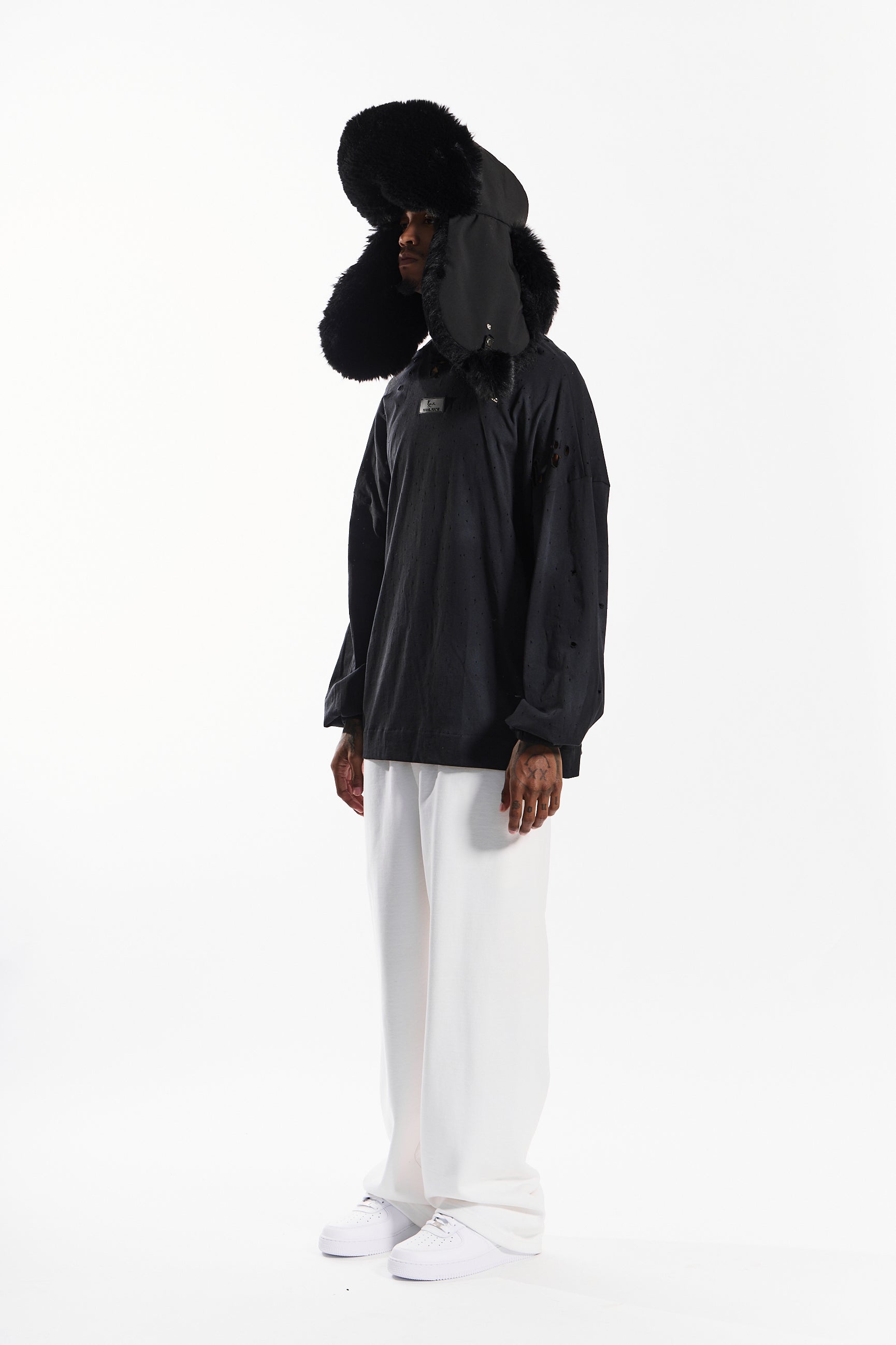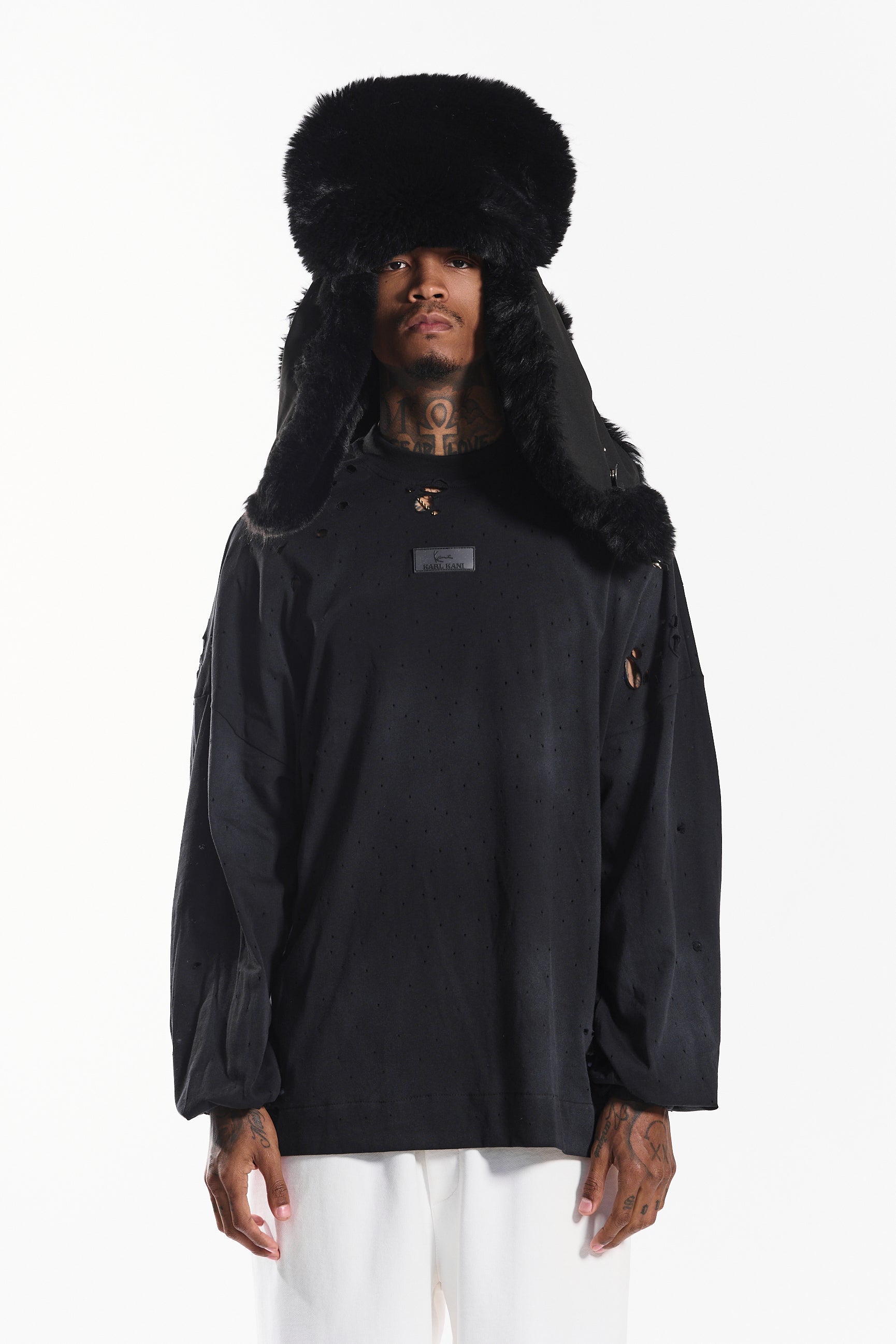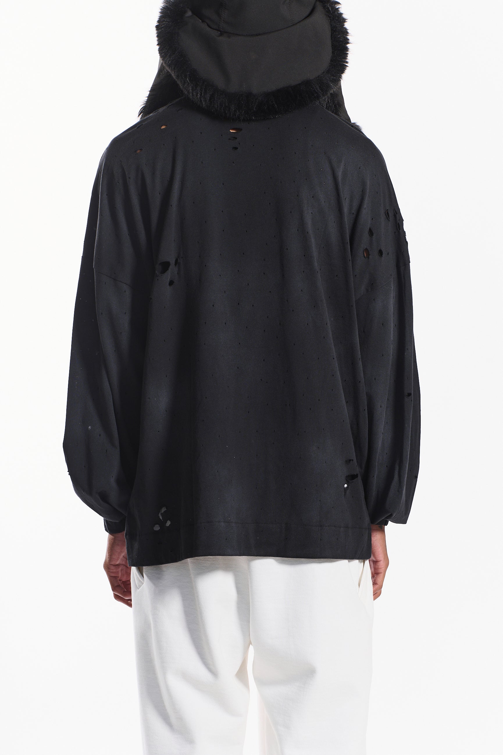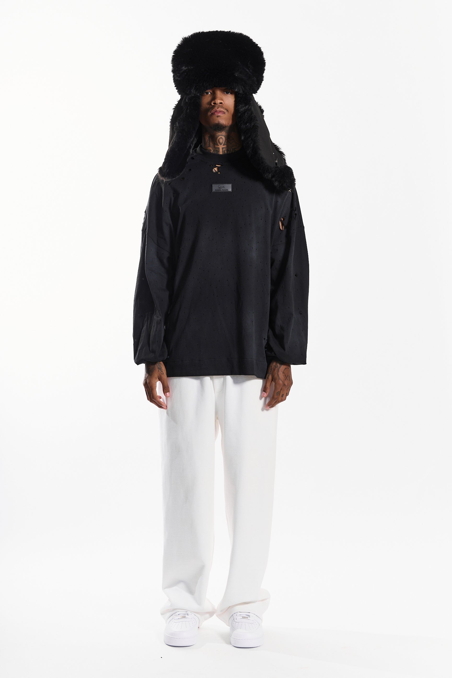 The “Loose Rap” long sleeve tee in noir black redefines everyday streetwear with a distressed, lived-in edge.