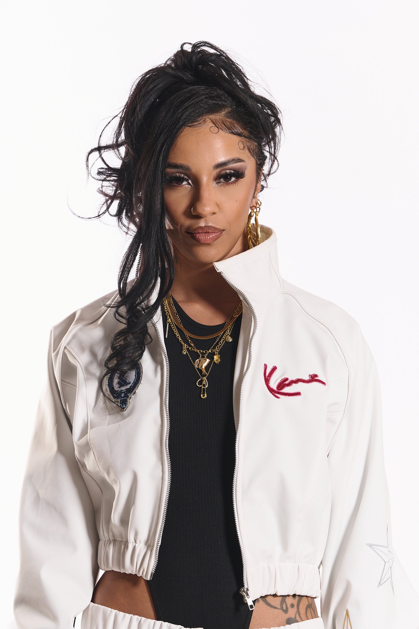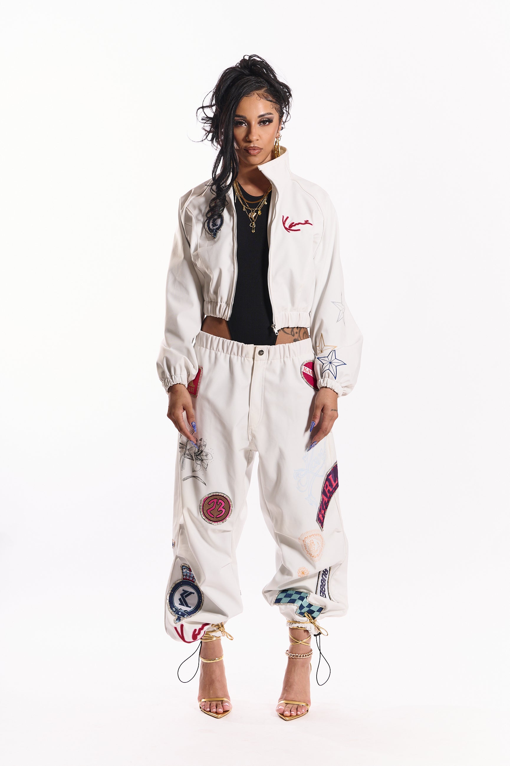 The “Lyte” jacket redefines streetwear with elevated artistry and technical precision. Cut from lightweight nylon in cloud whisper white, it features a sleek zip-front design with elasticated trims. Finished with shimmering sequin patches and intricate hand-drawn embroidery, it captures movement, texture, and individuality in every detail.
