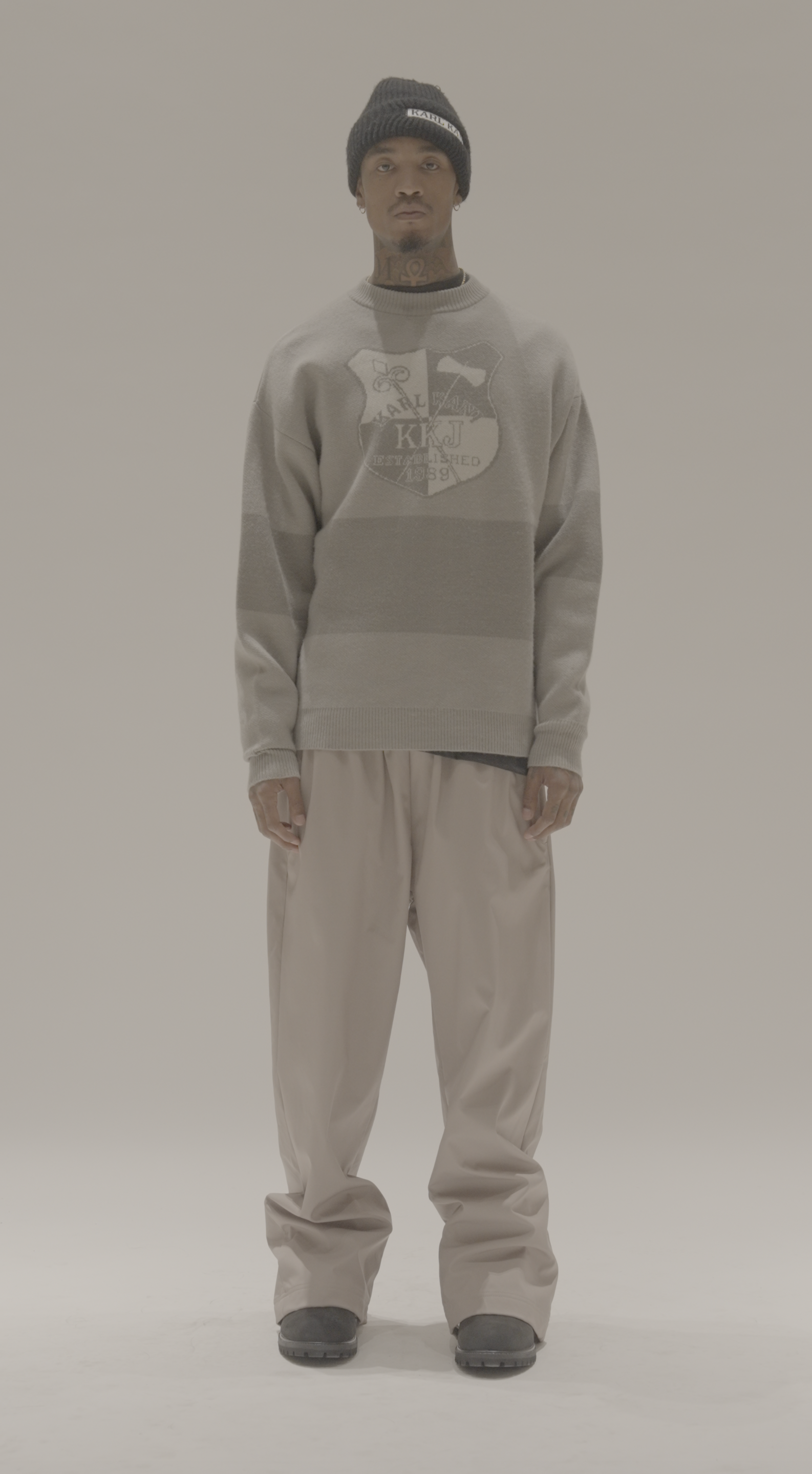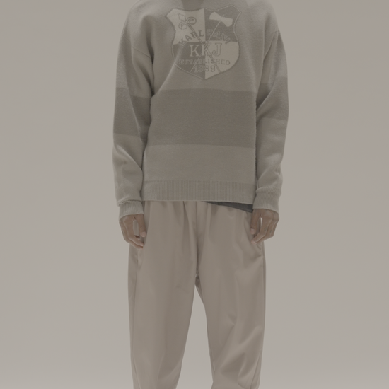 Featuring a refined taupe and grey color-block design, this premium knit is styled with a classic crew neck, long sleeves, and ribbed cuffs and hem for a polished fit. A bold embroidered heritage crest motif adds a distinctive, elevated touch.