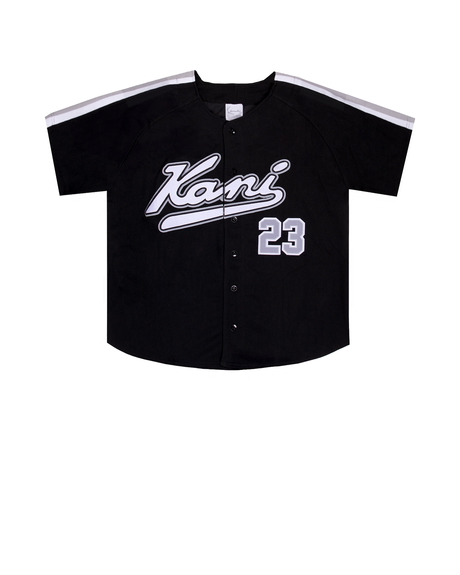 This “Playoff” baseball inspired short sleeve jersey comes in black and white – adorned with vintage 90's Kani logo.
