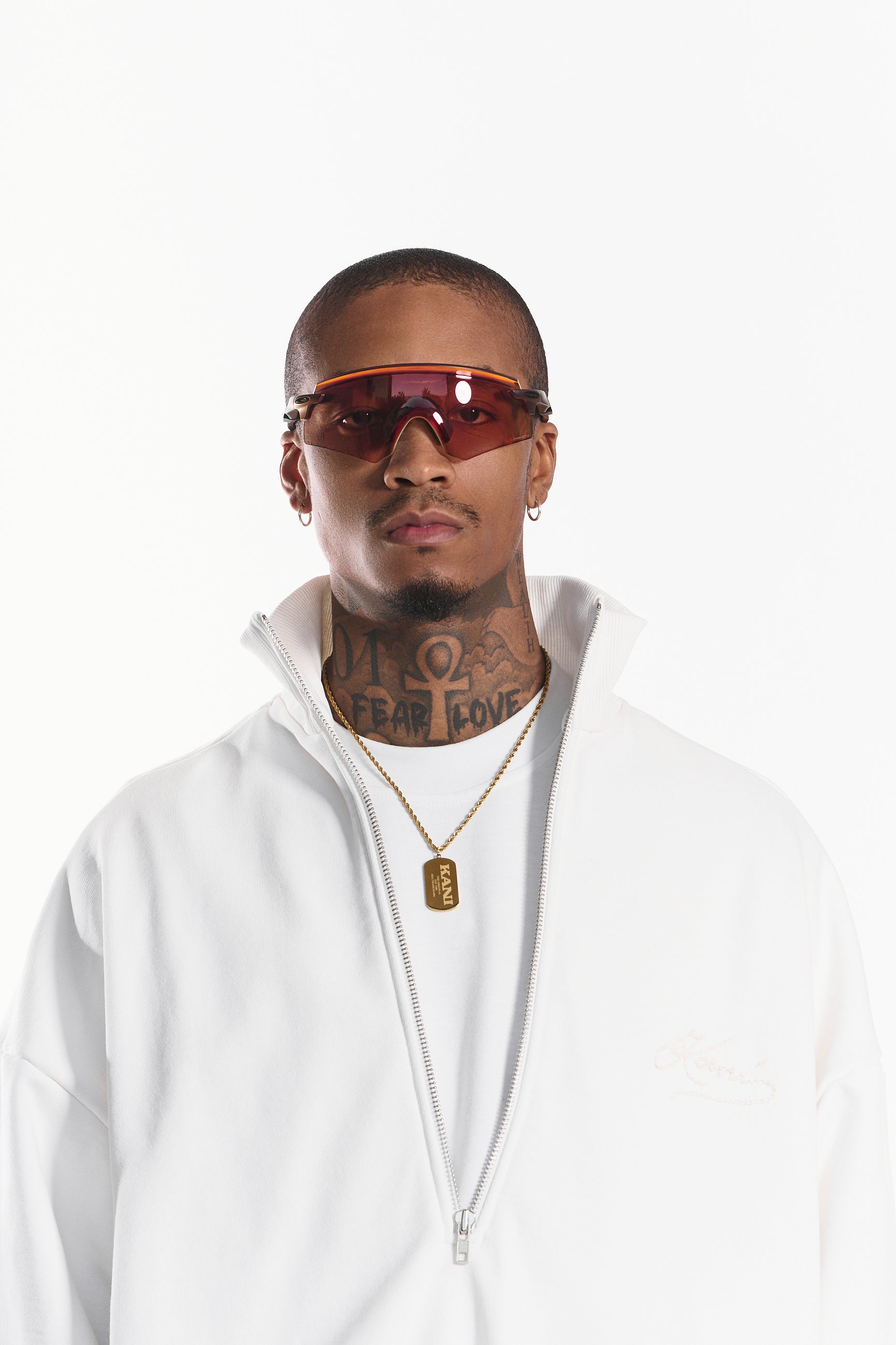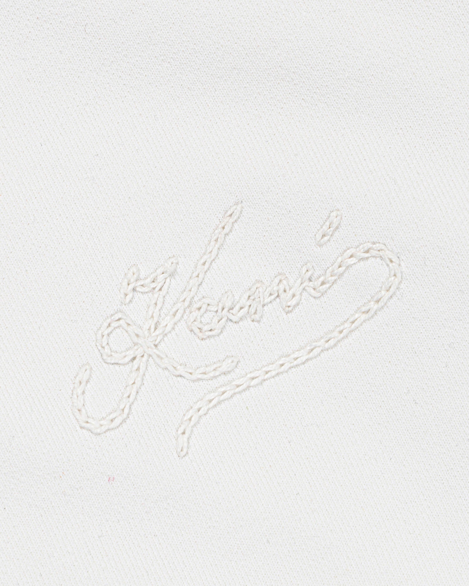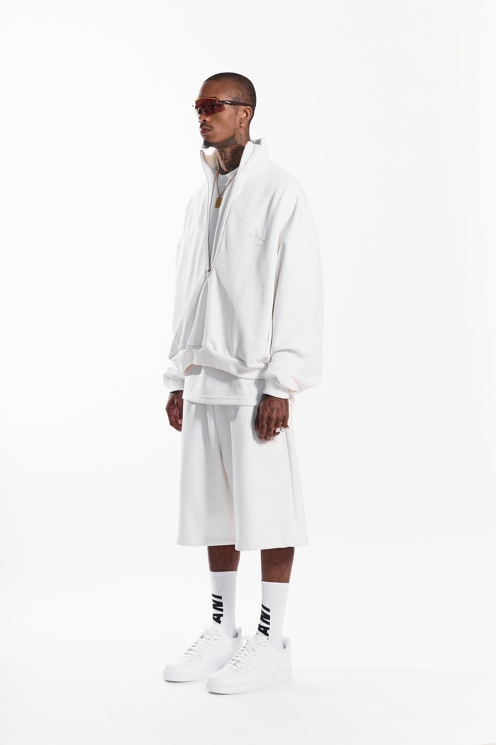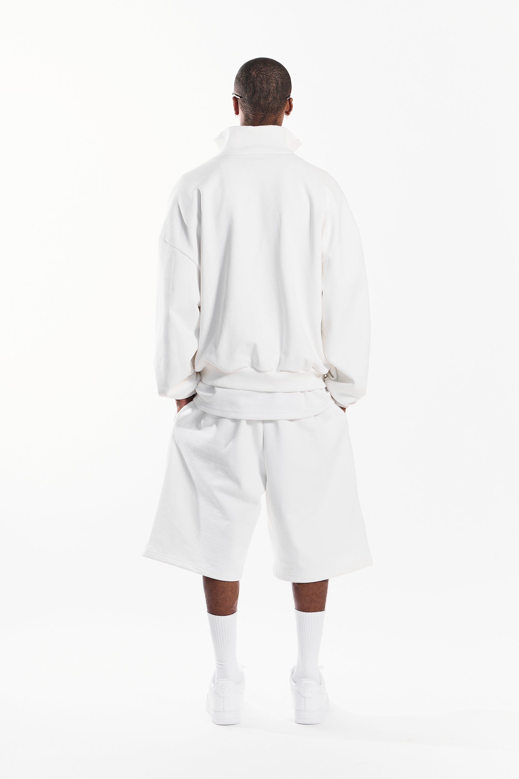 The “Rema” white half-zip pullover is made from soft, premium french terry, delivering both comfort and street-style edge. Featuring a tonal hand stitched embroidered logo detail on the chest, ribbed cuffs and hem.