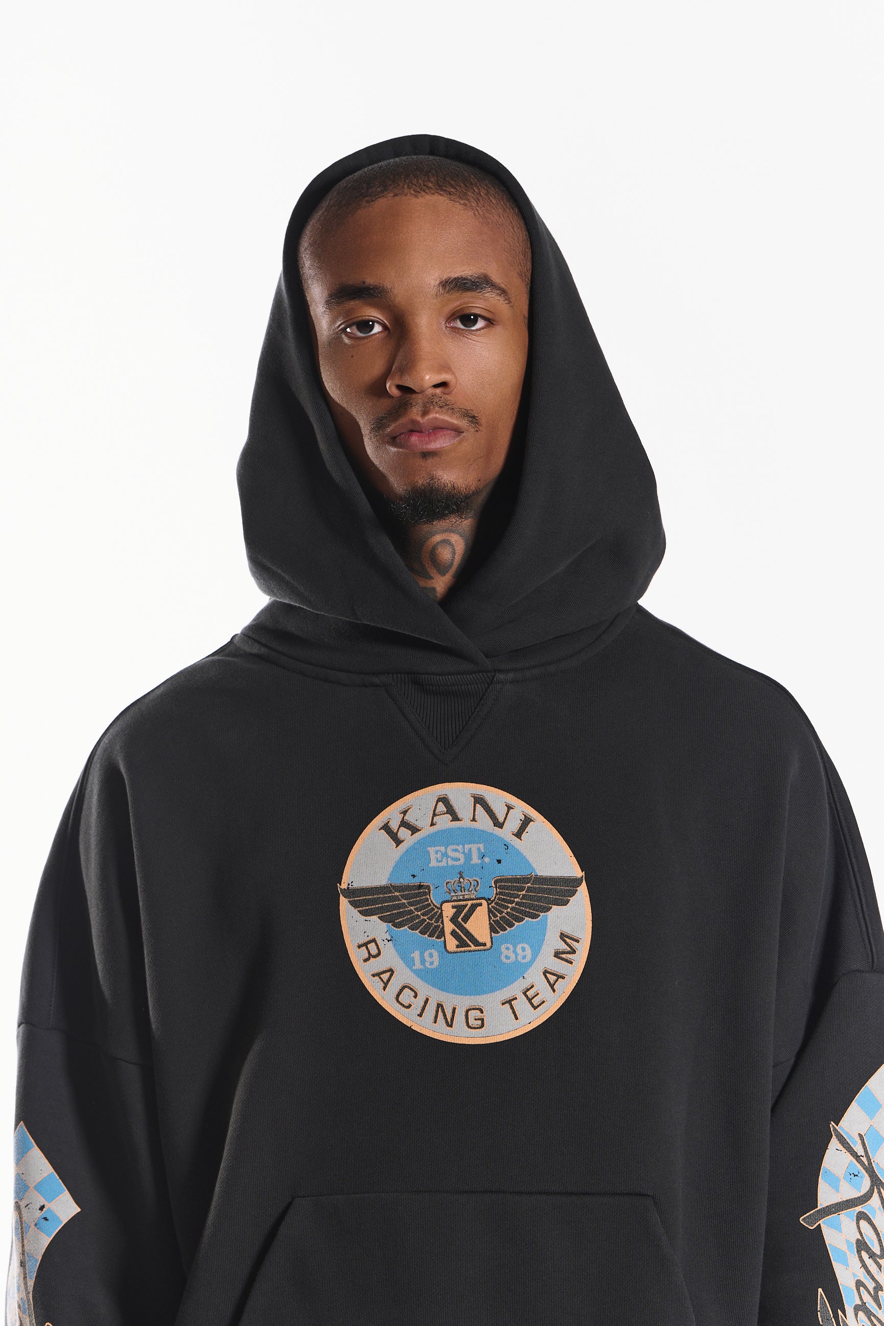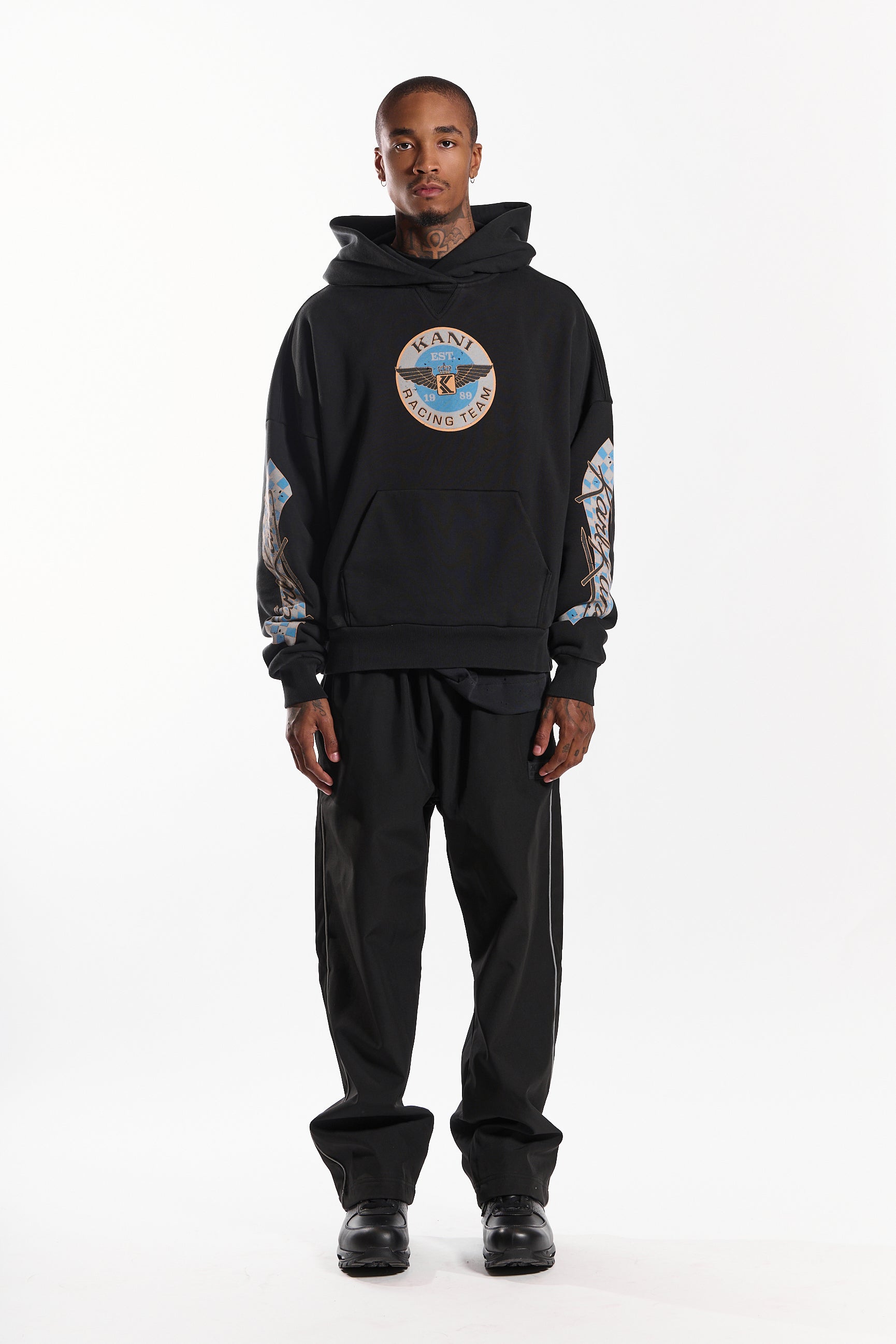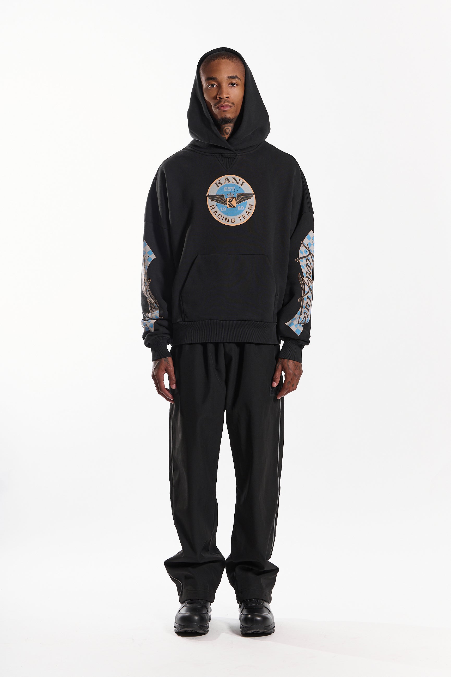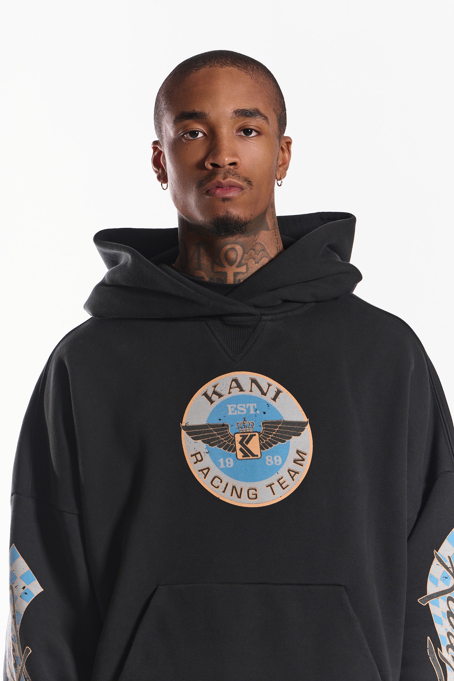 Crafted from 100% premium cotton, featuring a Kani racing inspired crest graphic on the chest and racing-inspired prints along the sleeves, it channels vintage motorsport culture with a modern edge. A classic kangaroo pocket, ribbed cuffs, and hem complete the design, making it both functional and stylish.