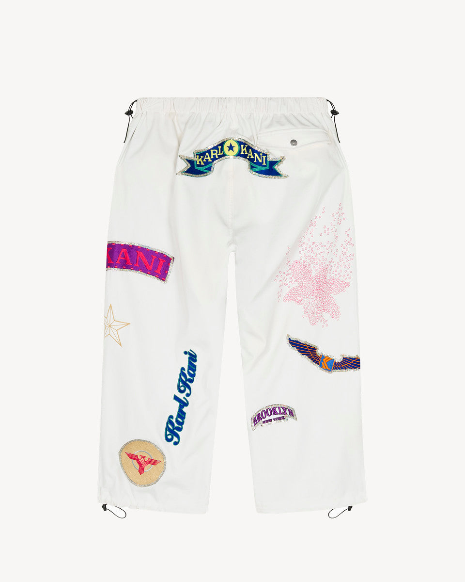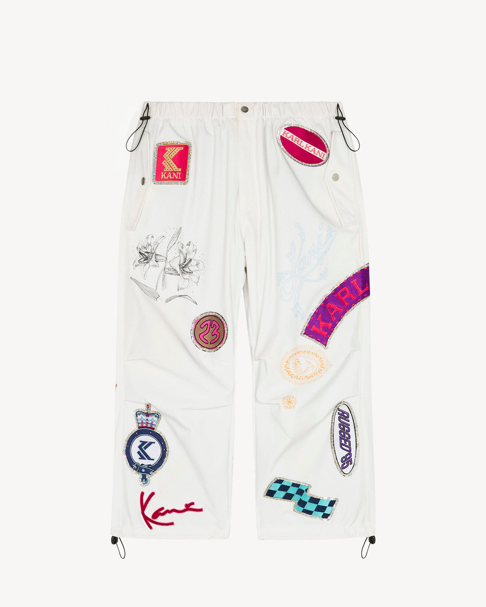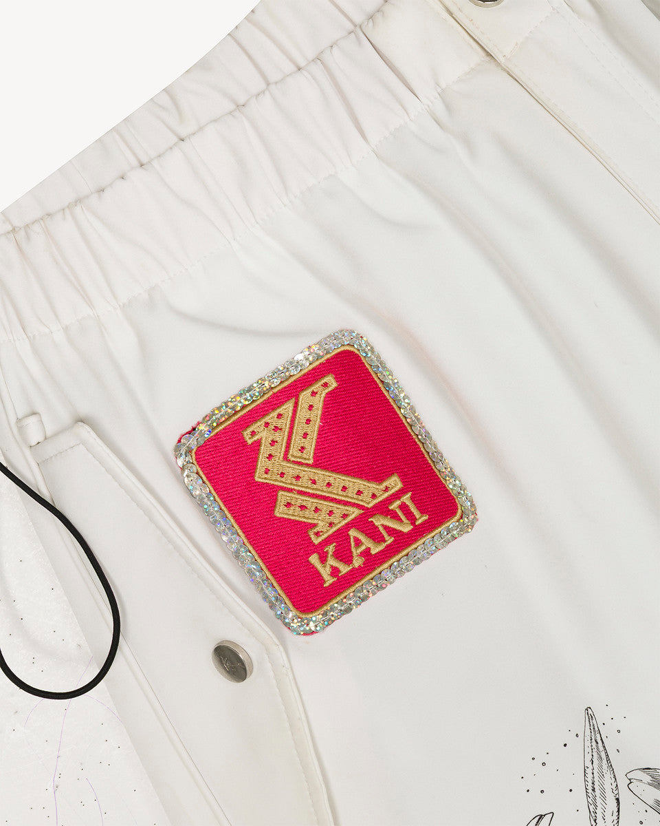 Make a statement in the “Rock” joggers, crafted from premium nylon fabric in sleek cloud whisper white. Featuring bold sequin patches and embroidered details, these joggers blend luxury and streetwear attitude. Designed with an elastic waistband and toggle drawcord hems for a perfect custom fit.