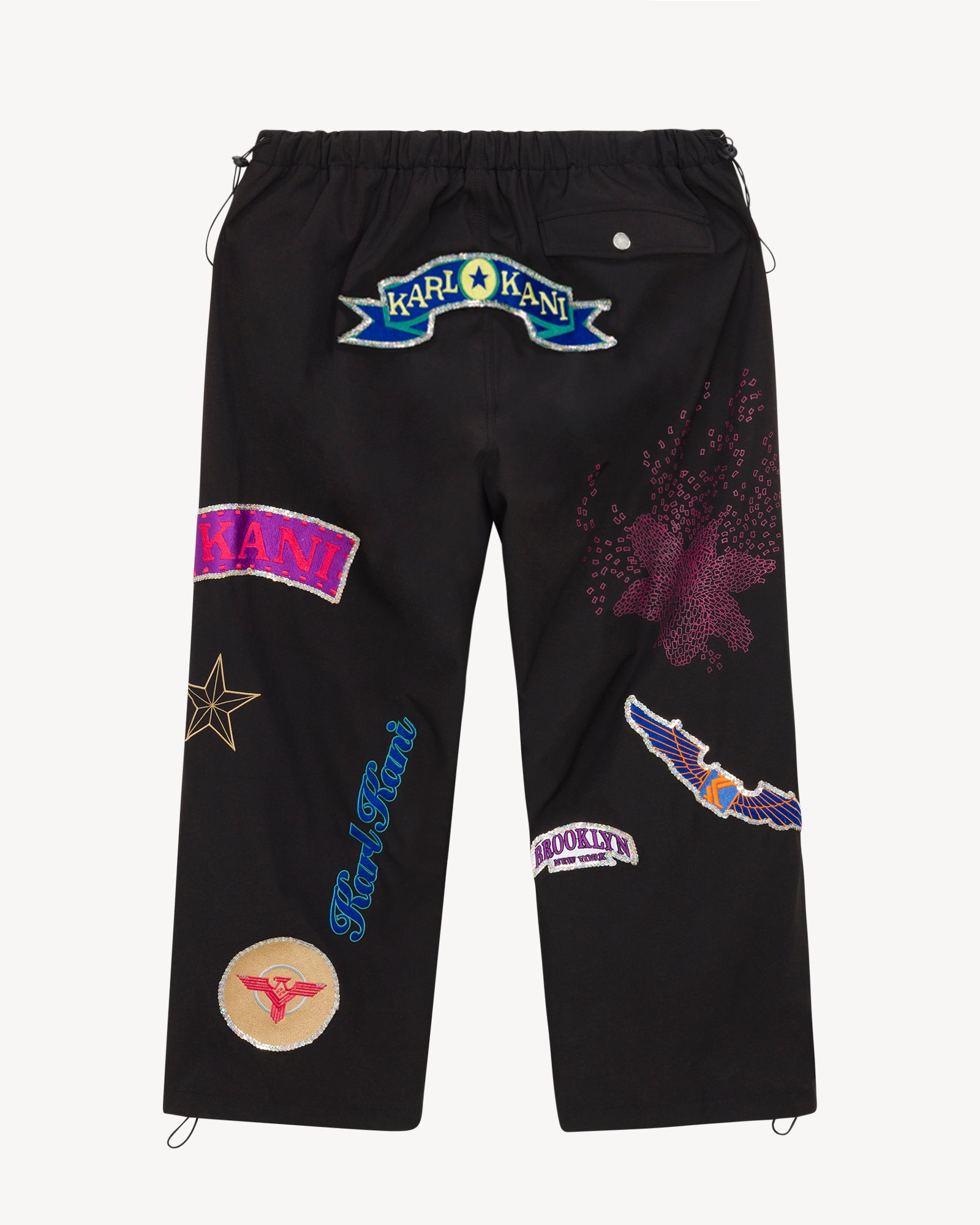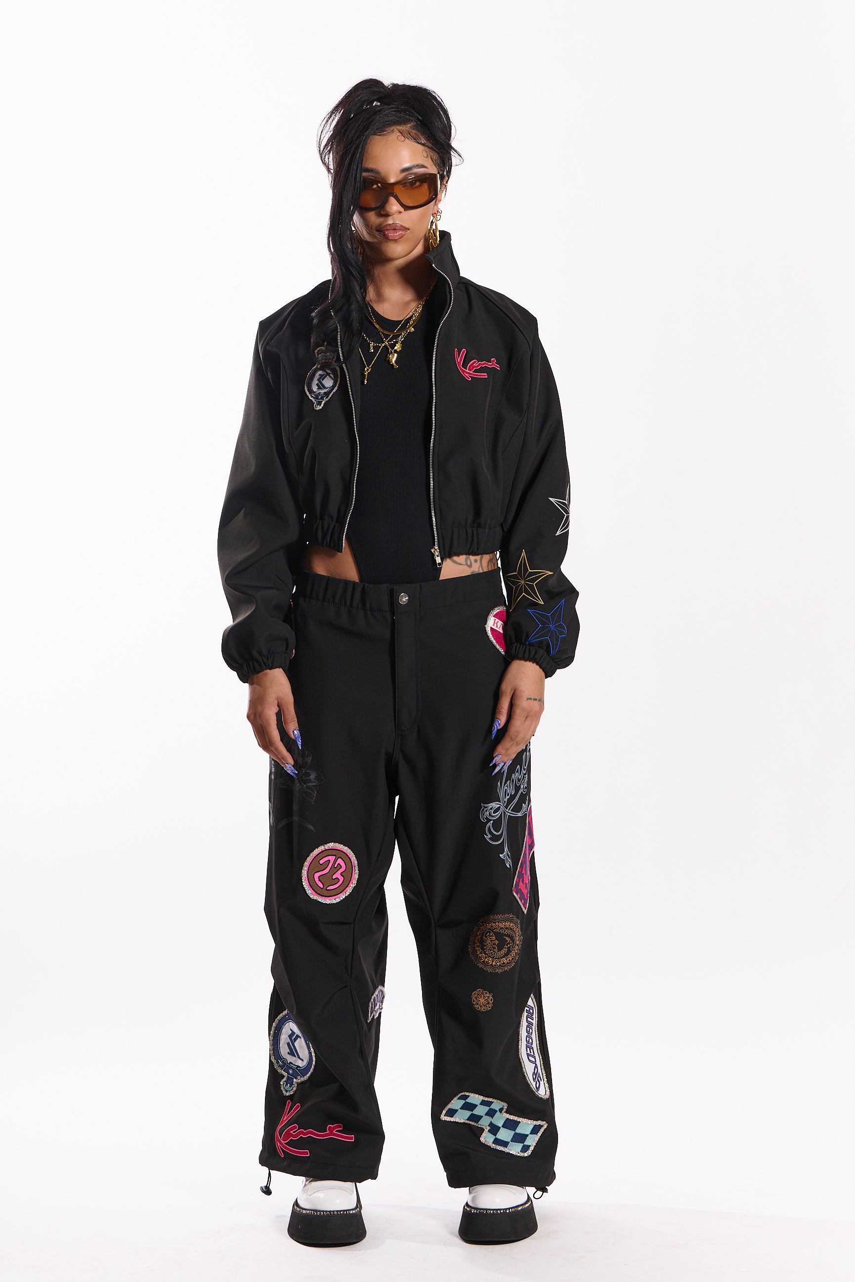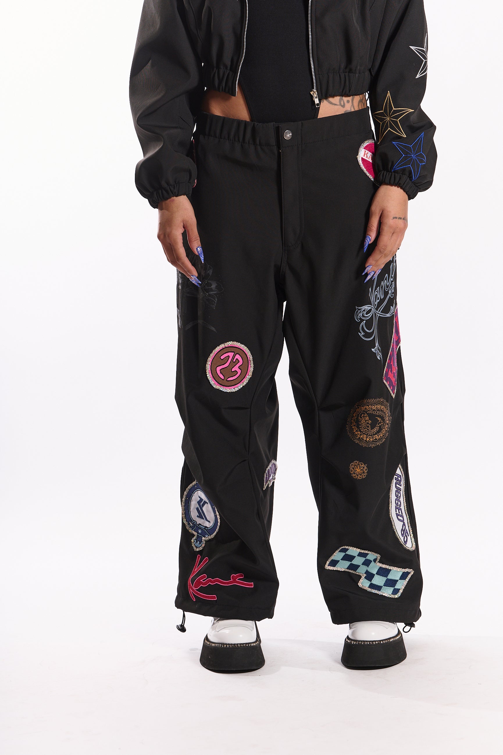 Make a statement in the “Rock” joggers, crafted from premium nylon fabric in classic noir black. Featuring bold sequin patches and embroidered details, these joggers blend luxury and streetwear attitude. Designed with an elastic waistband and toggle drawcord hems for a perfect custom fit.