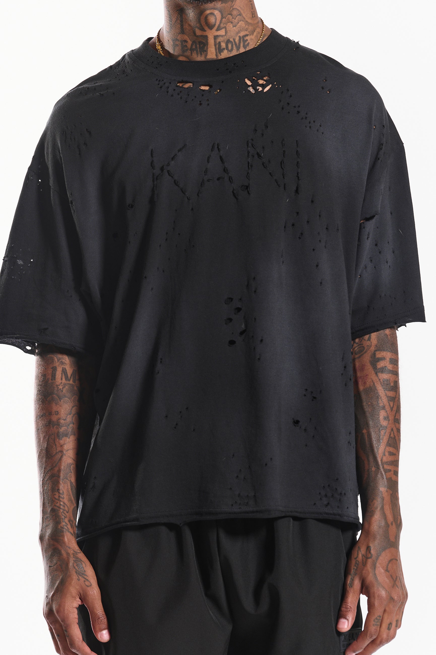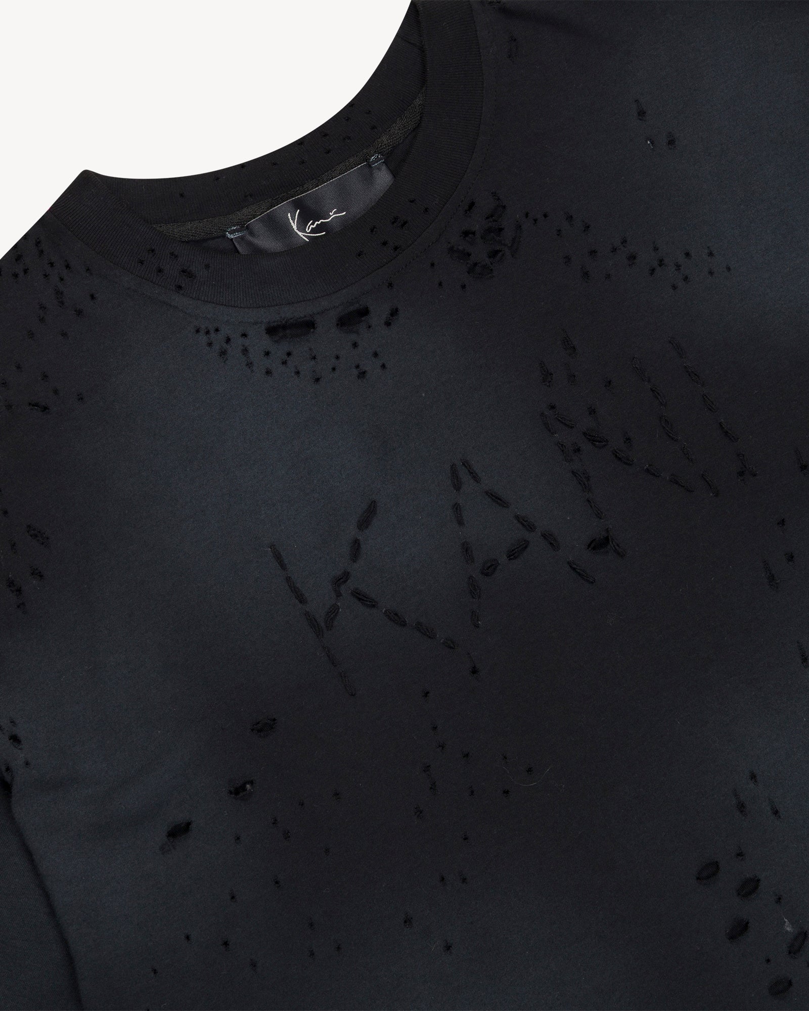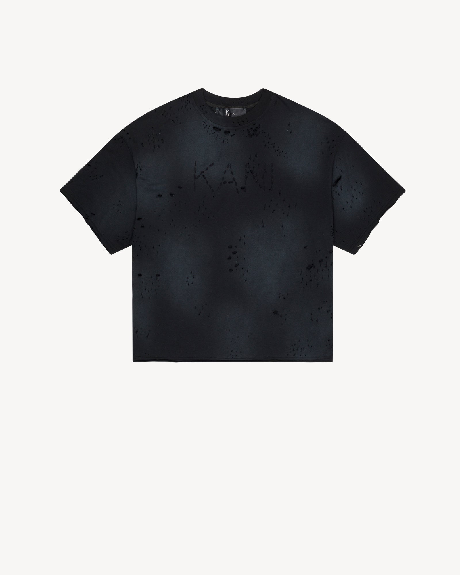 Crafted from lightweight 150 GSM cotton jersey, this tee delivers breathable comfort and a relaxed fit for everyday wear. The washed black finish is accented with tonal distressed detailing and a hand stitched KANI logo embroidery across the chest, giving it a raw, lived-in look that stands out in any rotation.
