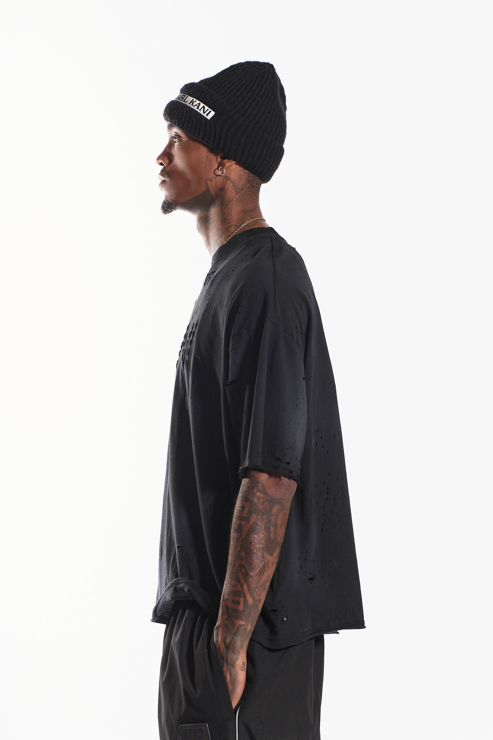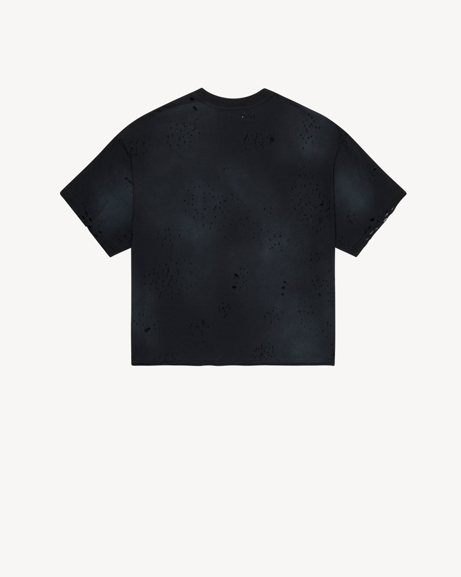 The “Rock the Boat” short sleeve ee in Noir Black blends effortless streetwear style with a bold, distressed edge.