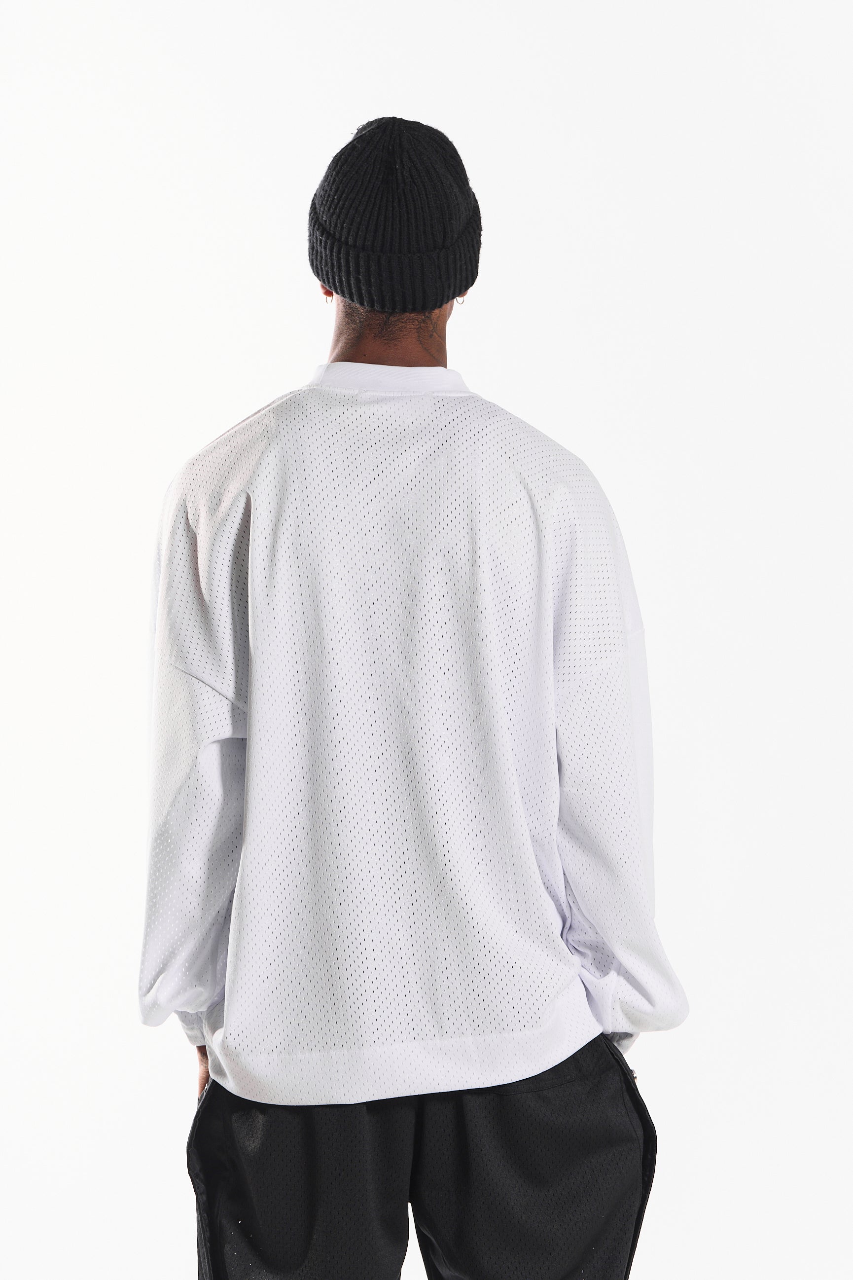 The “Saratoga” long sleeve tee in cloud whisper white blends sporty streetwear style with lightweight comfort.