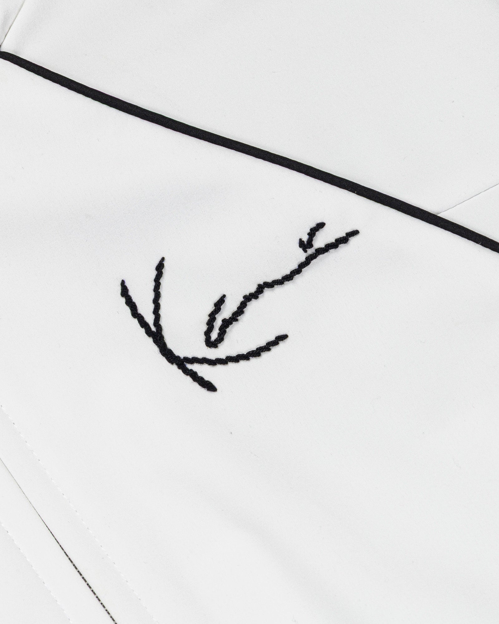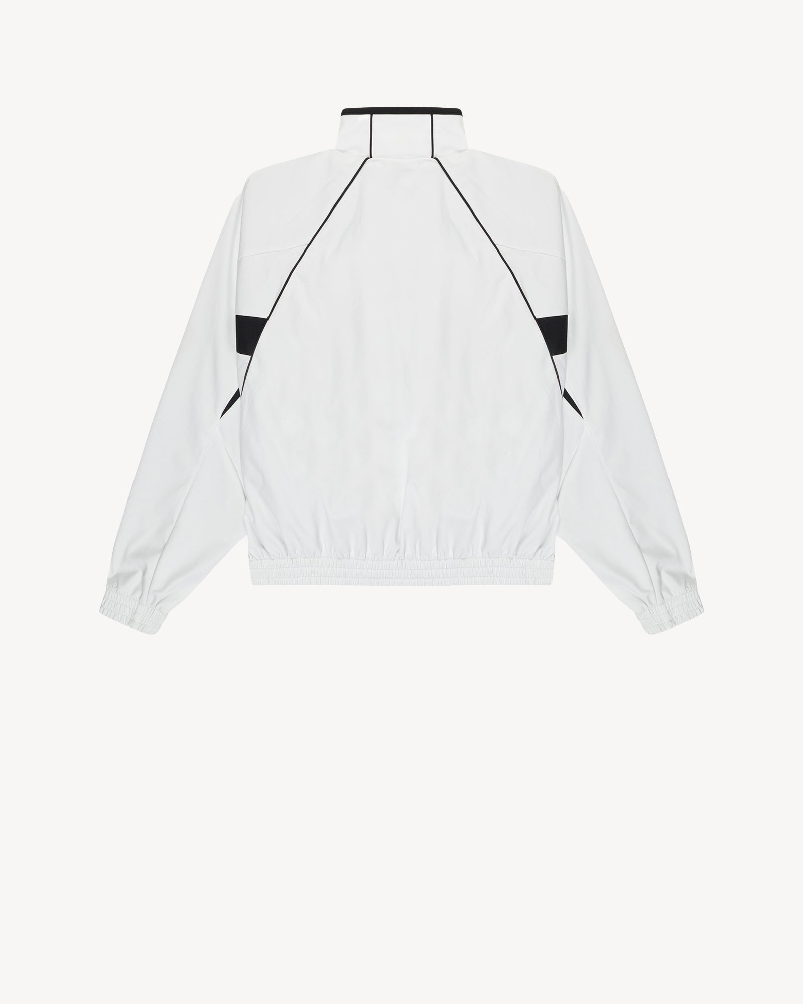 Crafted from cloud whisper white softshell nylon mesh, the “Shot Clock” jacket features a sleek stand collar and a zip closure for a modern, athletic look.
