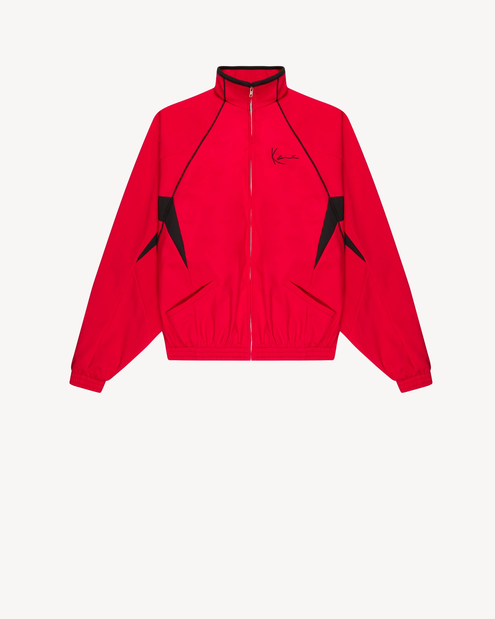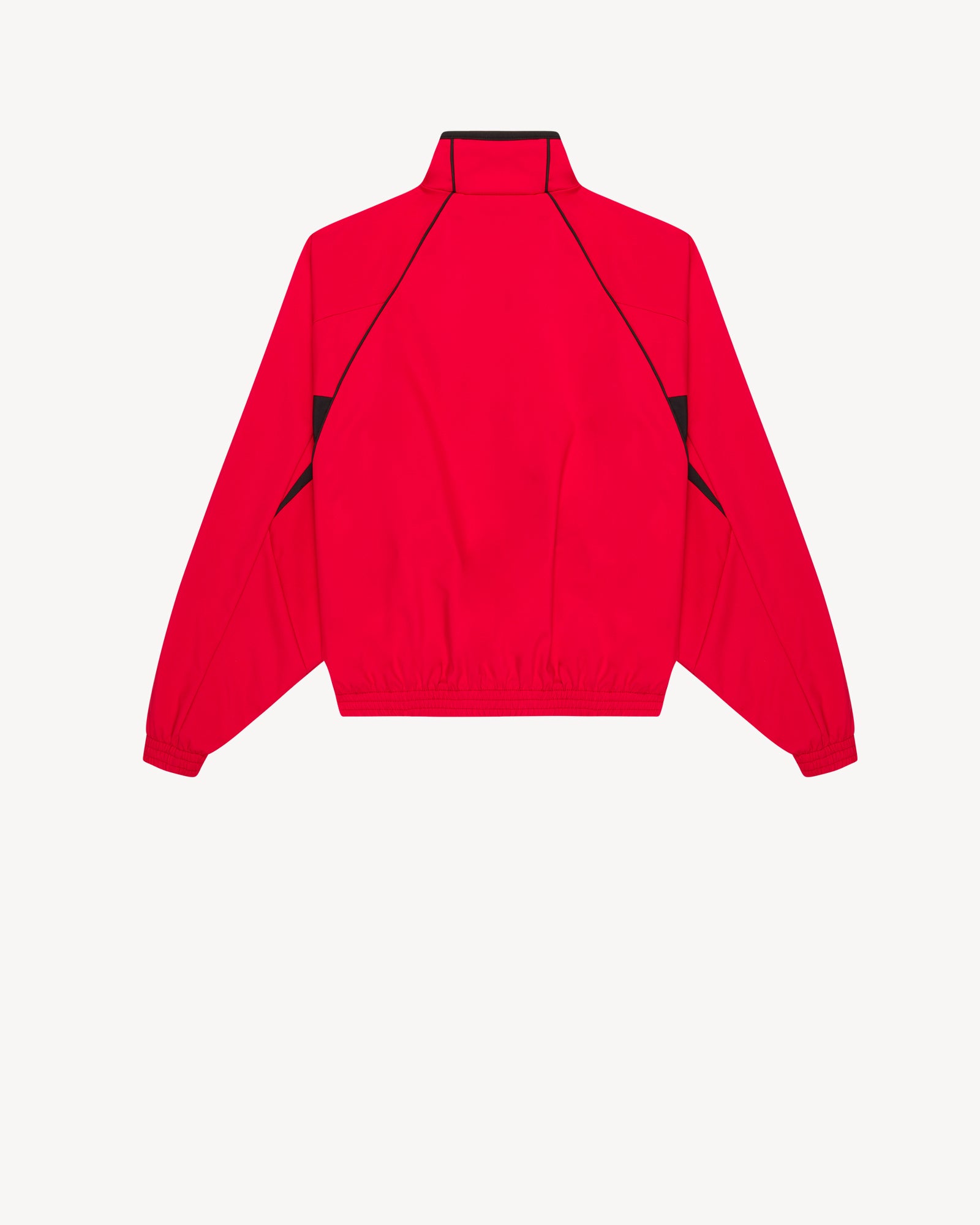 Crafted from red softshell nylon mesh, the “Shot Clock” jacket features a sleek stand collar and a zip closure for a modern, athletic look.